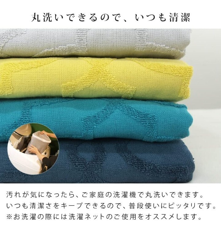 肌がよろこぶ柔らかく優しい肌触りコットン100%素材。気軽に使える心地よさ、柄部分のパイルがないことで肌に接する部分が少なくなり、サラっとベタつきにくい使用感で快適です。軽いのでお子様でも体に負担をかけずにお使いいただけます。