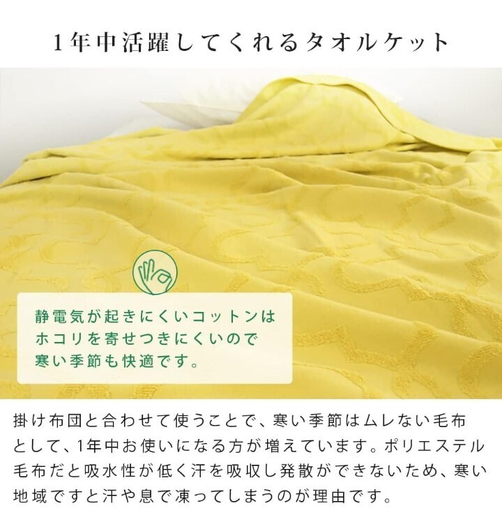 軽くて重苦しくなく、お肌のデリケートな方もお子様も安心。春夏だけでなく、寒い季節も掛け布団と合わせて使うことで、ムレない毛布としてオールシーズンお使いいただけます。