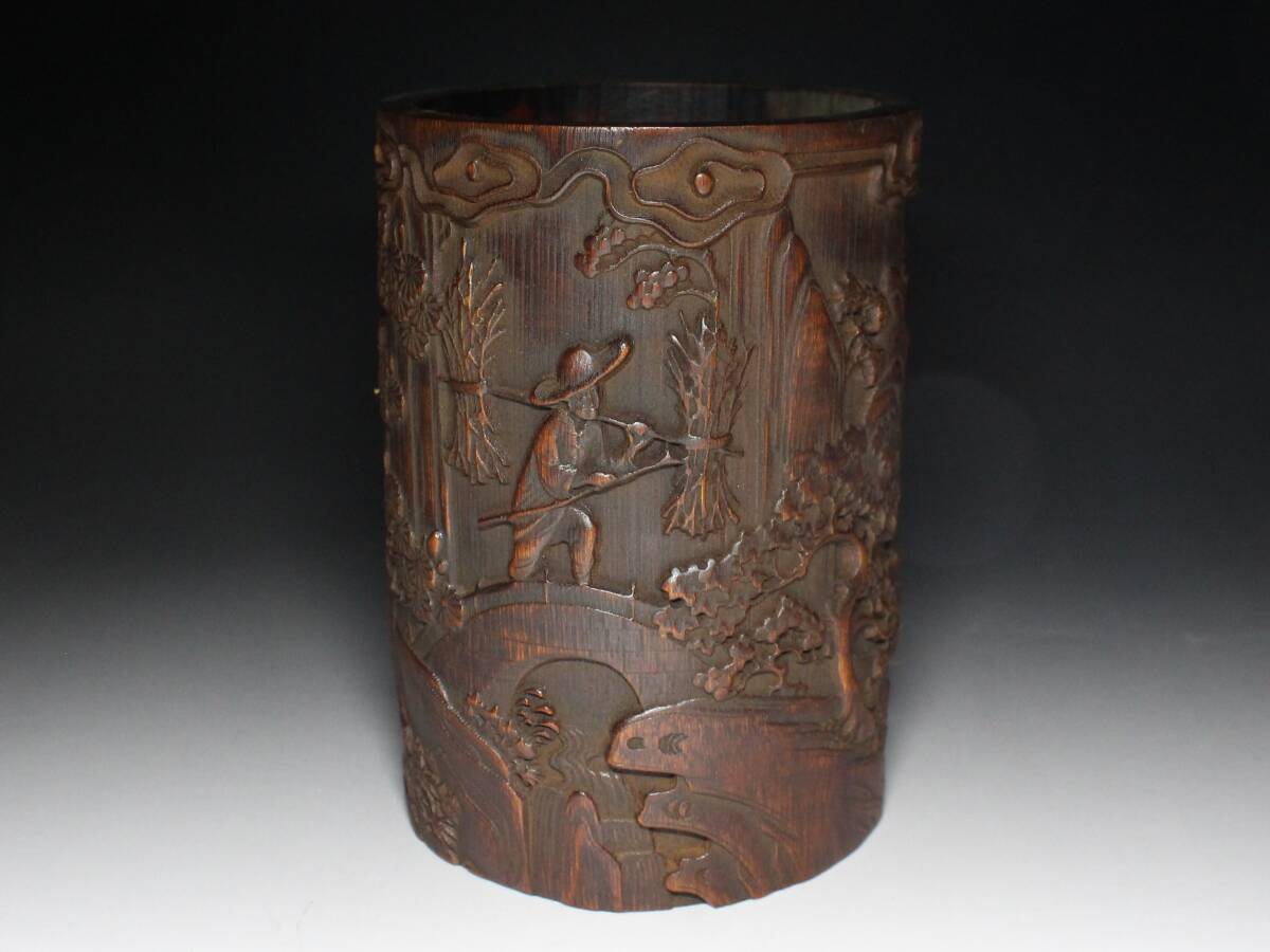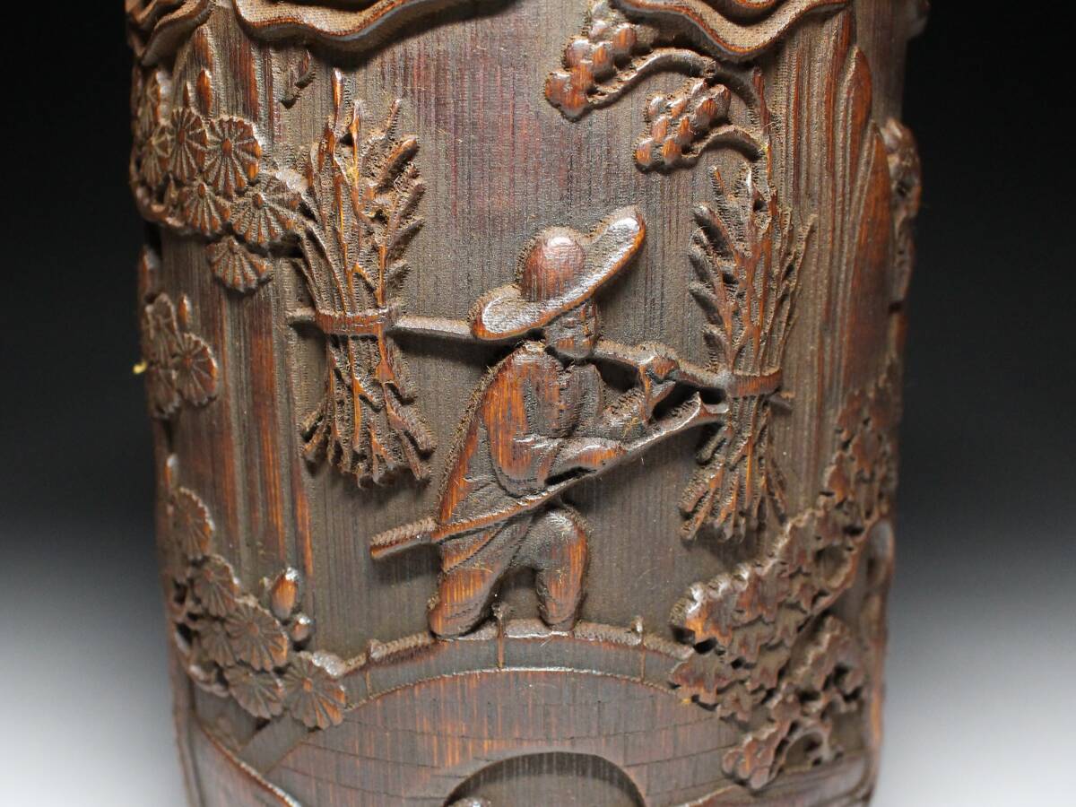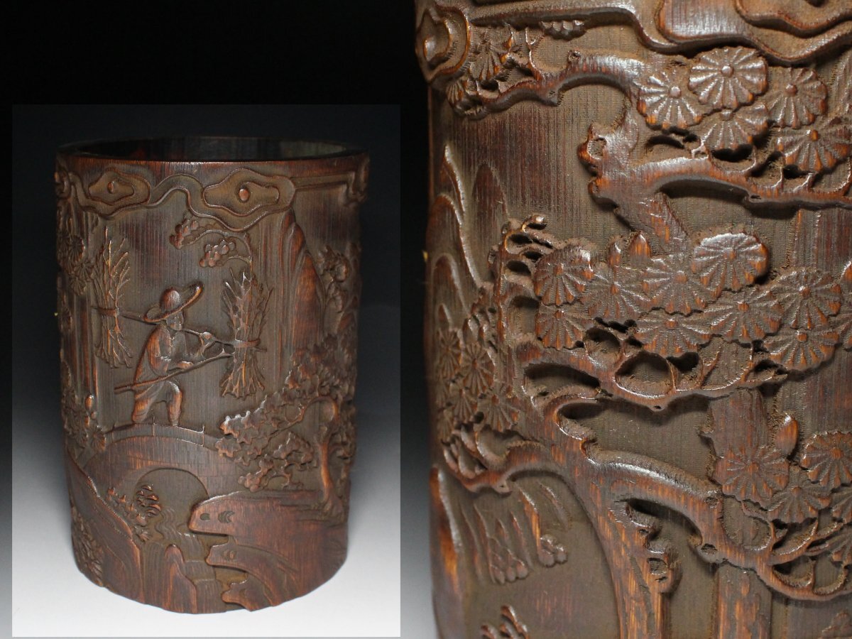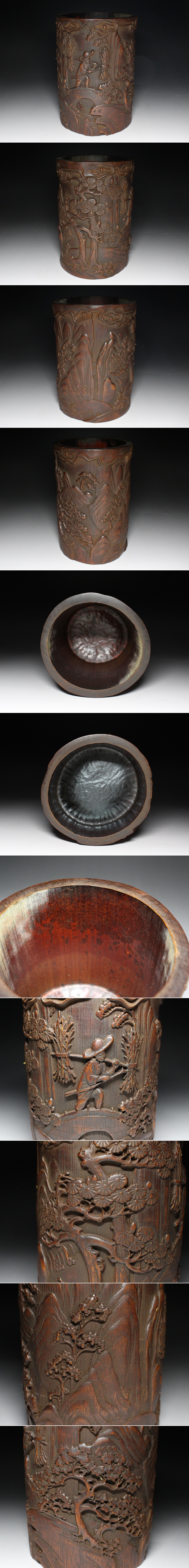 | ■中国古玩■古竹・筆筒・筆立・人物山水図紋・盛上彫・超細密細工・書道具・唐物・f2126h | ||||||||||||||||||||