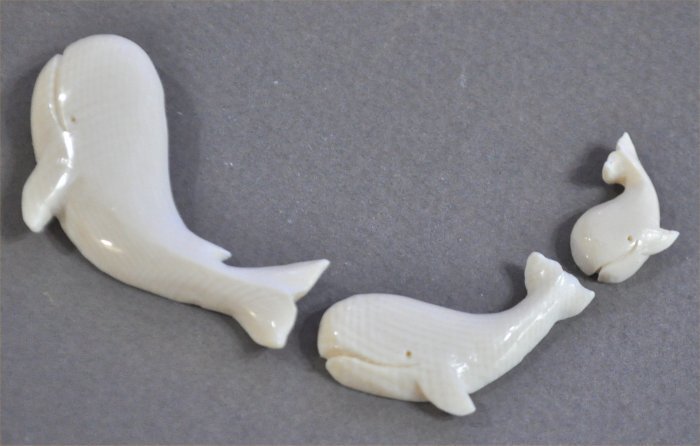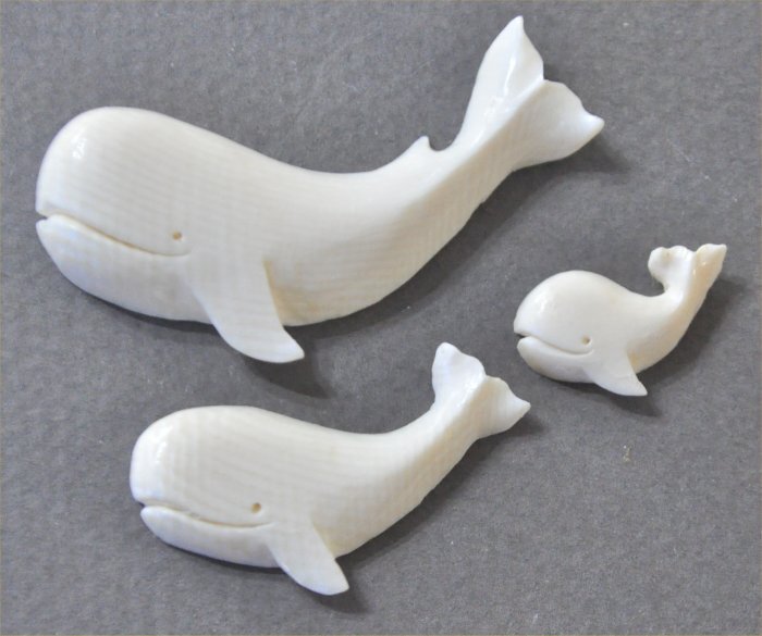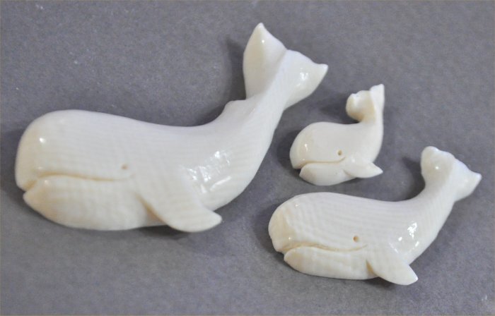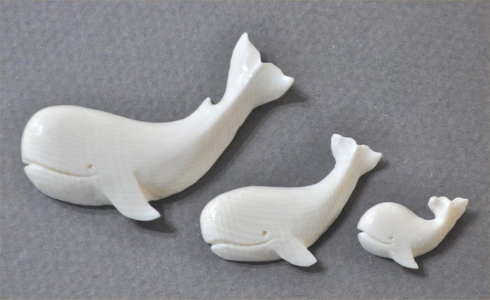ナンタケットバスケット用のマンモス牙の家族クジラオーナメントサイズは52mm×27mm厚み9mm 36mm×20mm厚み6mm 21mm×13mm厚み4mm磨き仕上げクジラ家族が仲良く泳いでいる姿です。