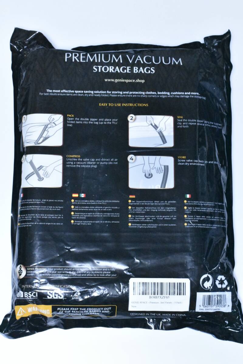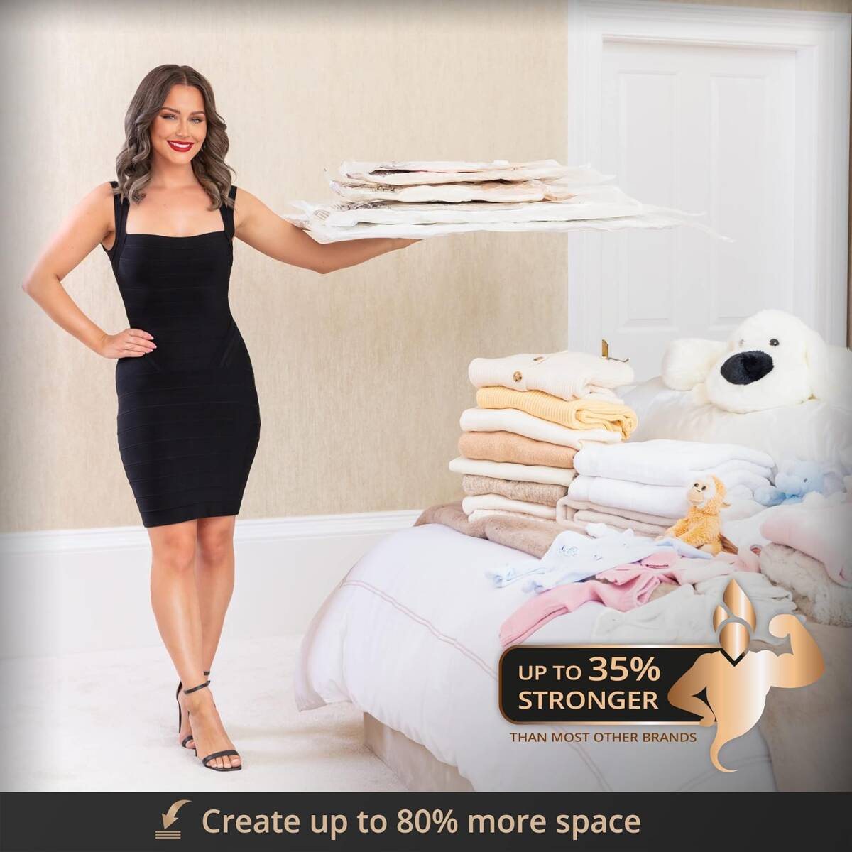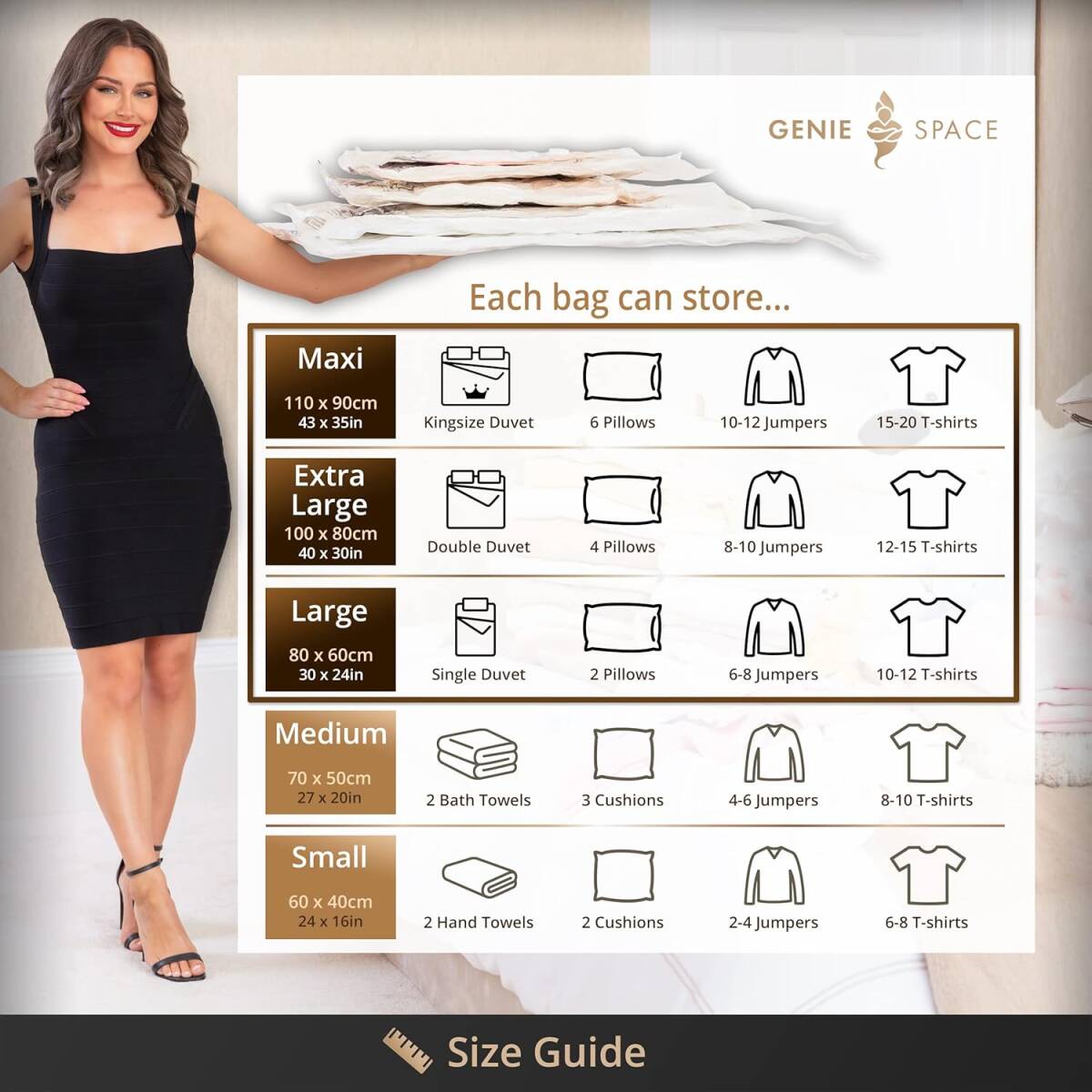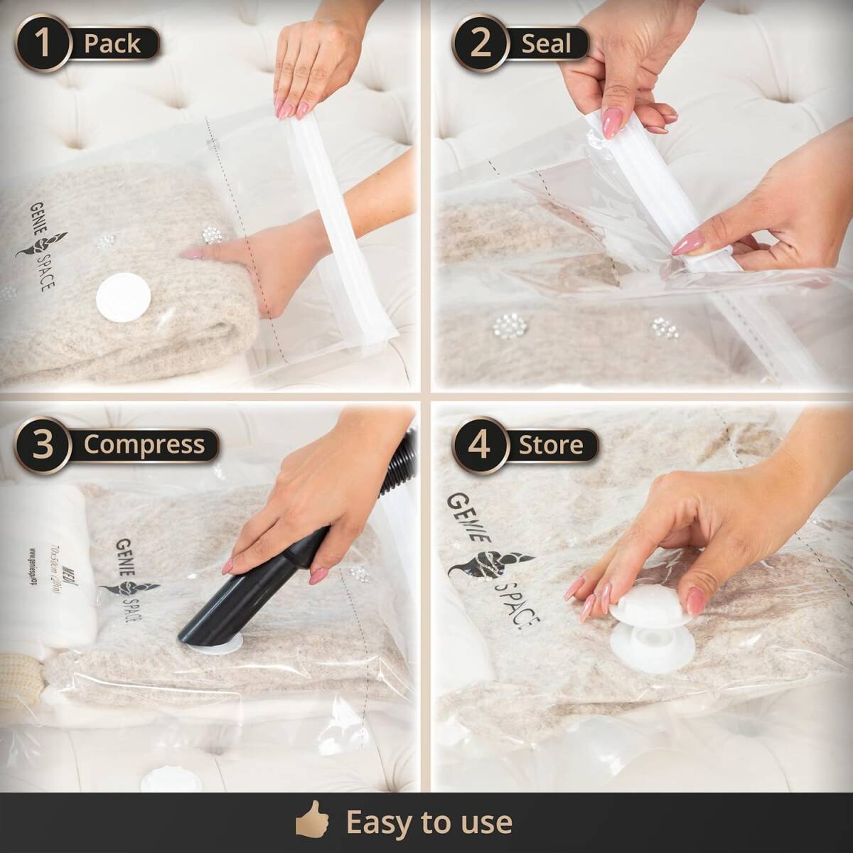 • 80% 以上のスペースを確保 - この衣類用真空バッグは、元のアイテムのサイズの最大 80% まで圧縮できます (スペースが 4 倍になります)。衣類の収納だけでなく、キルト、カーテン、寝具、タオル、クッション、ぬいぐるみなどを詰めて、家の散らかりを減らし、整理するのにも使用できます。圧縮後は、GENIE SPACE バッグをクローゼット、ワードローブ、ベッドの下、ロフト、ガレージなどにしまって、再び必要なときに使用してください。