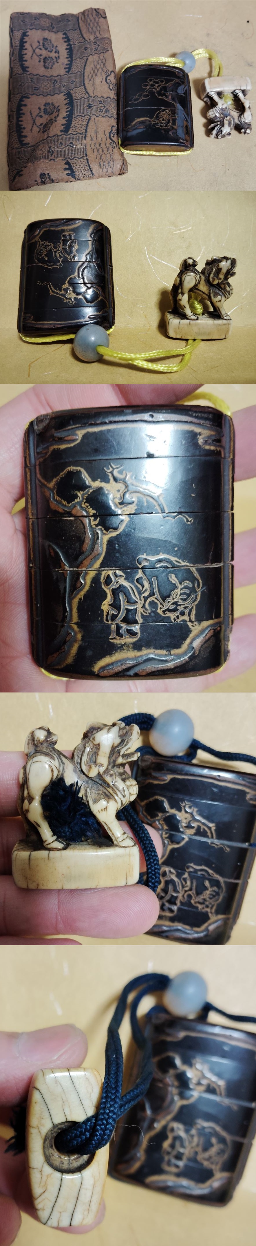 江戸 蒔絵 御印籠 人物図 内梨地 獅子形根付 東洋彫刻 細密細工 瑪瑙 緒締 提げ物 腰提 時代物 袋付