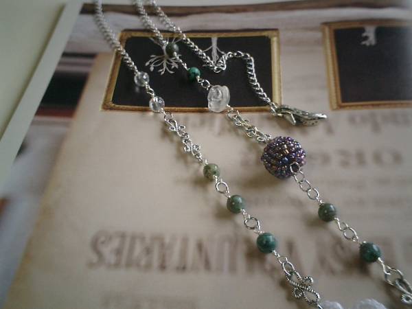 パリの子供たちシリーズです♪ターコイズ編です♪ターコイズとキュートで可愛い素材を集めたデザイン違いのシリーズです♪!ターコイズは6ミリの丸玉です♪シックなパープルのビーズ玉や30ミリの綿レースのお花や12ミリの薔薇、6ミリのラウンドカットの水晶やピンクトルマリンのコインやお花のチャームを合わせてシックで可愛い表情です♪長さは全長83センチ位で調節自由です♪シンプルで飽きのこないいつまでも着けられるデザインを考えて作りました!お揃いのブレスレットやシリーズも出品しています♪ハンドメイドをご理解頂いてノークレーム、ノーリターンでお願いします