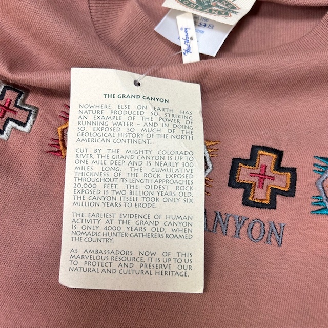 ●商品説明・・・アメリカ古着になります。deadstockの90年代頃のオールド・ヴィンテージのGRAND CANYONのネイティブっぽい柄が刺繍されたTシャツです。made in USA (アメリカ製)で、素材はコットンで、色は薄茶色(ライトブラウン)です。肩のラインの落ちるゆったり着ていただけるシルエット感です。袖はシングルステッチです。