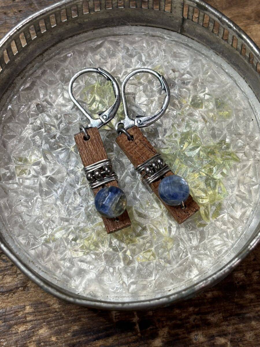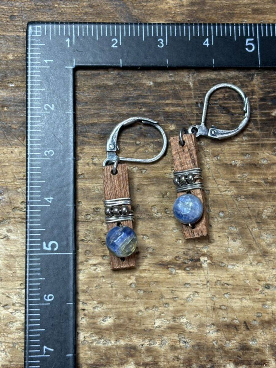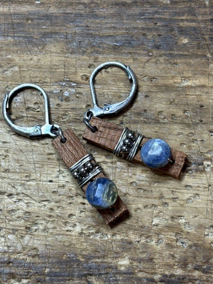 カイヤナイトコインカットをワイヤーワークでフレンチフックピアスにしました。マホガニーの板材を加工して巻き付けたちょっと変わったデザインに仕上げました。