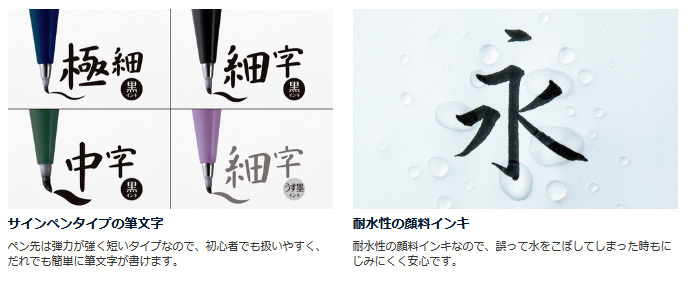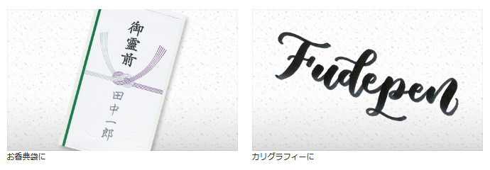 だれでも簡単に筆文字が書ける。線の強弱をつけやすいので、香典袋など不祝儀利用はもちろんイラスト描きにも適している。
