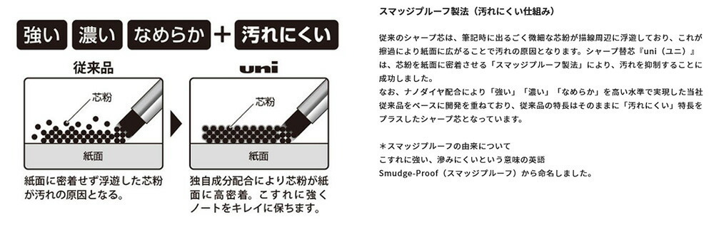 独自成分配合により芯粉が紙面に高密着。くっきり濃い文字を書くことができ、かつ、こすれに強いため筆記後のノートをキレイに保ちます。紙面同士の擦過や手の接触 (注1)による紙面の汚れを抑制するため、何度も見返すノート作りに最適なシャープ替芯です。