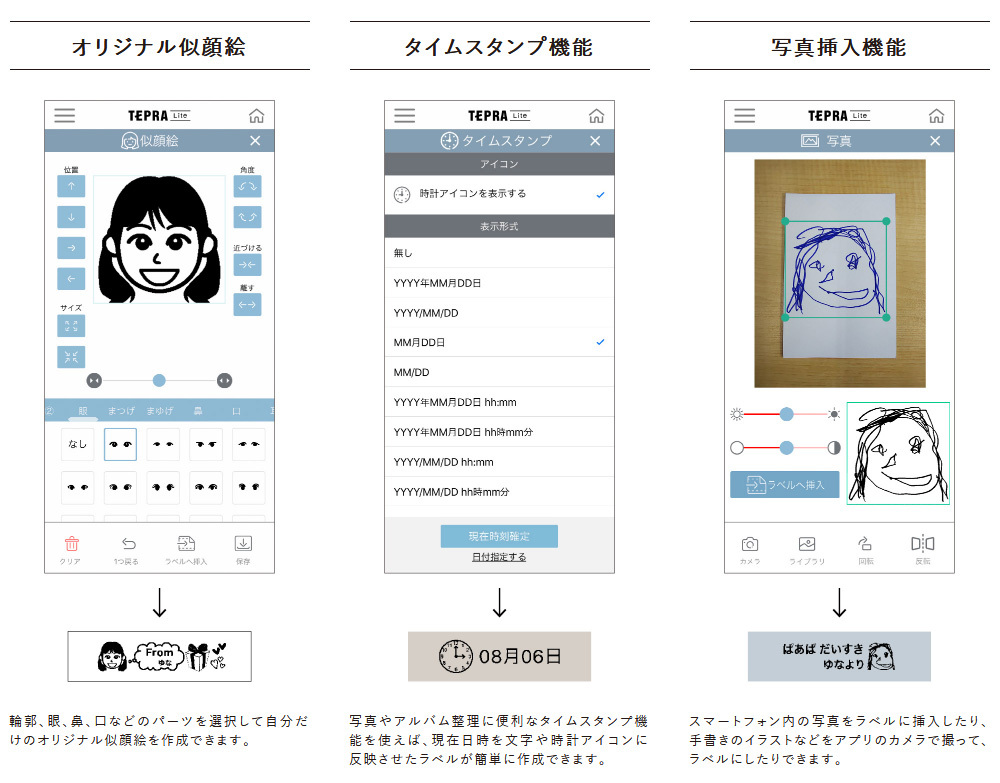 スマートフォンで撮影した写真をラベルに挿入して印刷できます。手書きの絵や文字を撮影し、ラベルに挿入するなど幅広く活用できます。