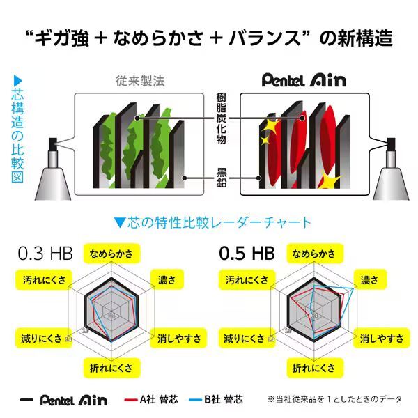 ・原材料に特殊なオイルを使用する新製法により、筆記時には黒鉛と樹脂炭化物がなめらかに崩れるため、なめらかな筆記感を実現しています。