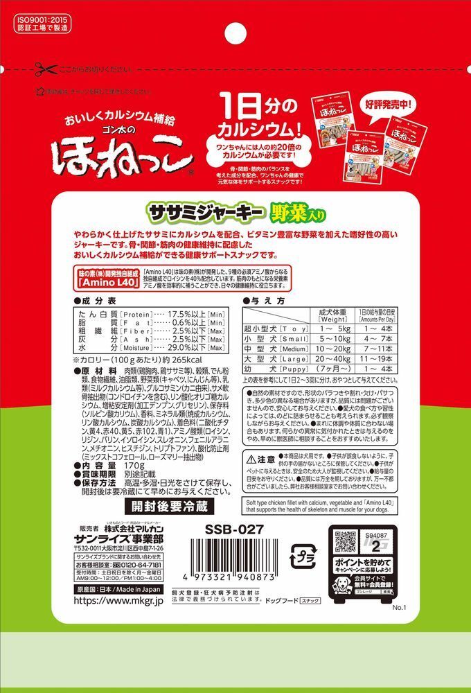 人の約20倍のカルシウムが必要な愛犬のために作られた、やわらかおいしい野菜入りのササミジャーキーです。