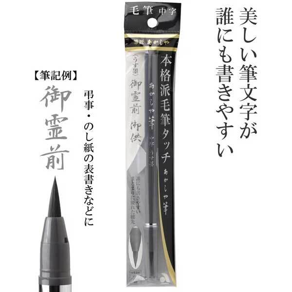 ○本物の筆と同じ毛組みで手づくりしており、本格派の毛筆タッチで、穂先がきき細くも太くも書ける万能な中字タイプです。