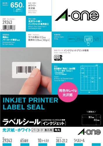 ◆色鮮やかに印刷できる、インクジェットプリンタ専用の光沢紙ラベルです。◆ネーム用やバーコード用のラベルが手軽にキレイに作れます。◆乾きが早く、にじまないので小さな文字や線もクッキリ印刷。 / ■ 仕様 ■入数:10シート(650片)シートサイズ:A4判(210×297mm)一片サイズ:38.1mm×21.2mm面付:65面 5列×13段厚み:165.0g/m2(0.18mm)ラベル・カード厚み:0.12mm材質:光沢コート紙用紙特性:光沢、はがしやすい白色度:0.84 / ※顔料インクでは、表面素材の特性上、インクが乾きにくいので、印刷面にはできるだけ触れないようにしてください。 |