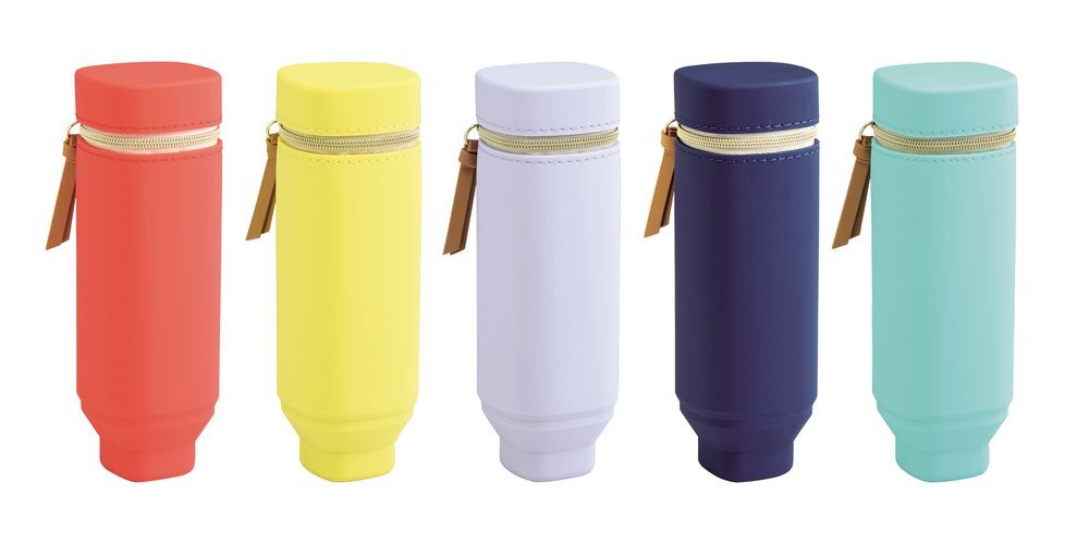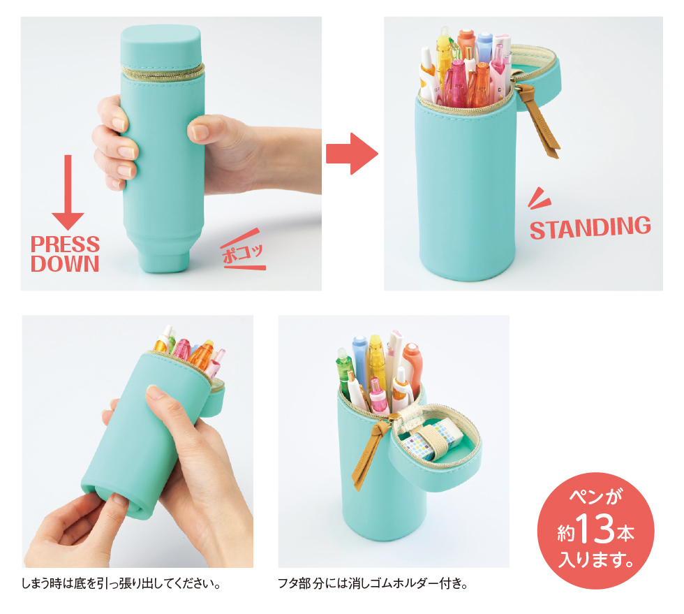 ○スリムでシンプルなデザインのスタンドペンケース〈スクエアタイプ〉は、上部のファスナーを開けてからペンケースを上から押すと底面が本体部に押し込まれてペンの先端が頭を出し、ペンスタンドに早変わりします。