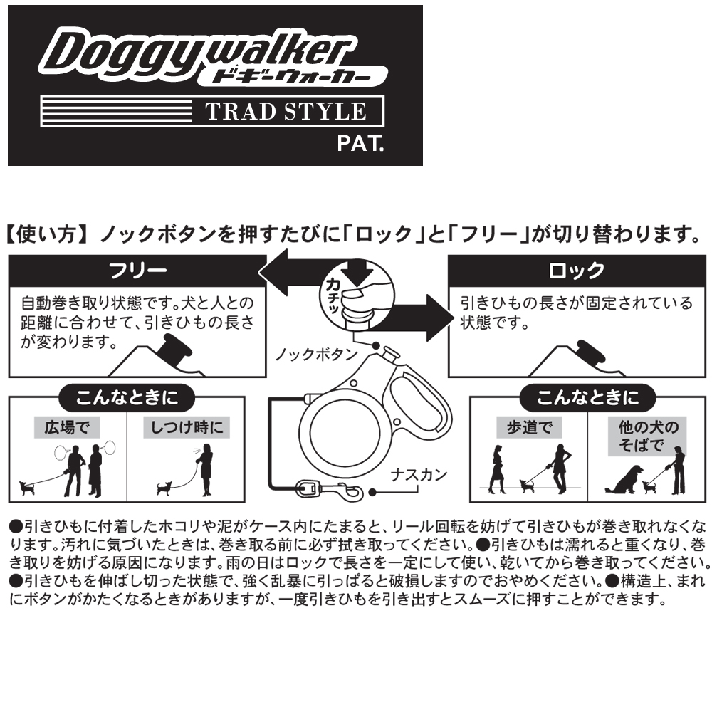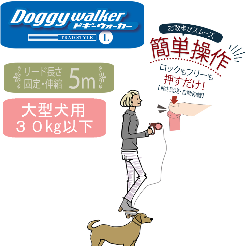 ヨーロッパの名車のような落ち着きと新しさを目指しました。 ドギーウォーカーのスタンダードなフォルムに、スタイリッシュでスマートなカラーと、トラッドのエッセンスを加えました。 親しみと少しの憧れが共存する、そんなお散歩シーンをイメージしてつくりました。 性別や年齢層を超えて愛されるトラッドのエッセンスを加えたトラッドスタイルシリーズです。 ・体重30kg以下の大型犬用。 ・丸ヒモ5mの伸縮リール式散歩用リード。 ・操作はボタン1つで、簡単!押してロック!押してフリーで使いやすい! ・握りやすくすべりにくいハンドル部ラバーカバー。