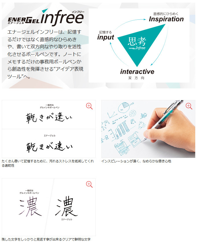 「なめらかな書き味」「クリアで鮮明な文字」「汚れにくい速乾性」を兼ね備えた水性ゲルインキボールペン、エナージェルの数量限定デザイン「エナージェルインフリー」。インク色がわかるクリア軸のデザインです。リフィルパイプが見えて一目でインク色がわかることにより、直感的に手に取ることができ、ストレスなく紙に向かうことができます。