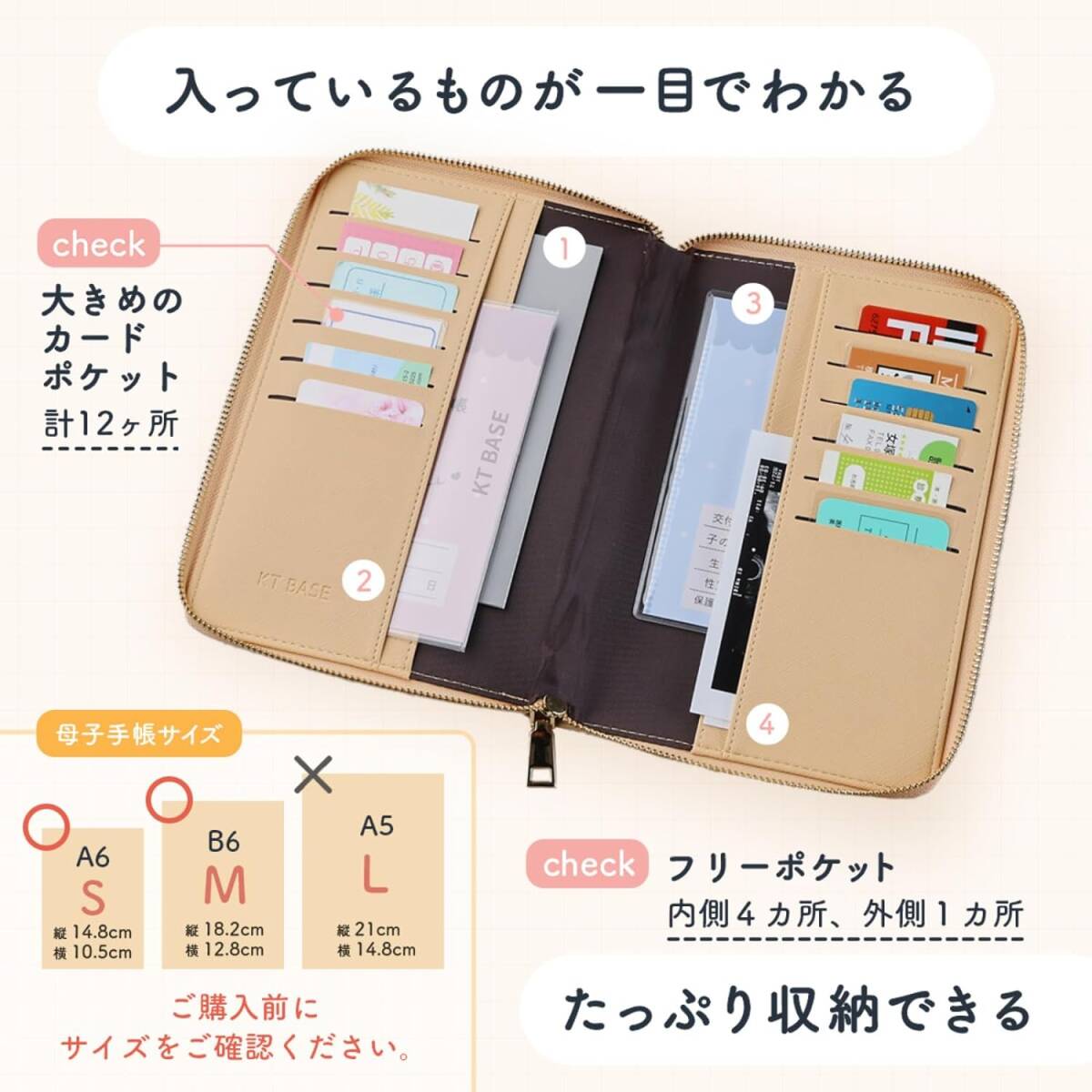 【整理収納アドバイザー推薦】 母子手帳ケース お薬手帳 ケース マルチポーチ 母子手帳 ケース 保険証 ケース 診察券ケース 通帳ケース お薬手帳 カバー KT BASE (SAND BEIGE)