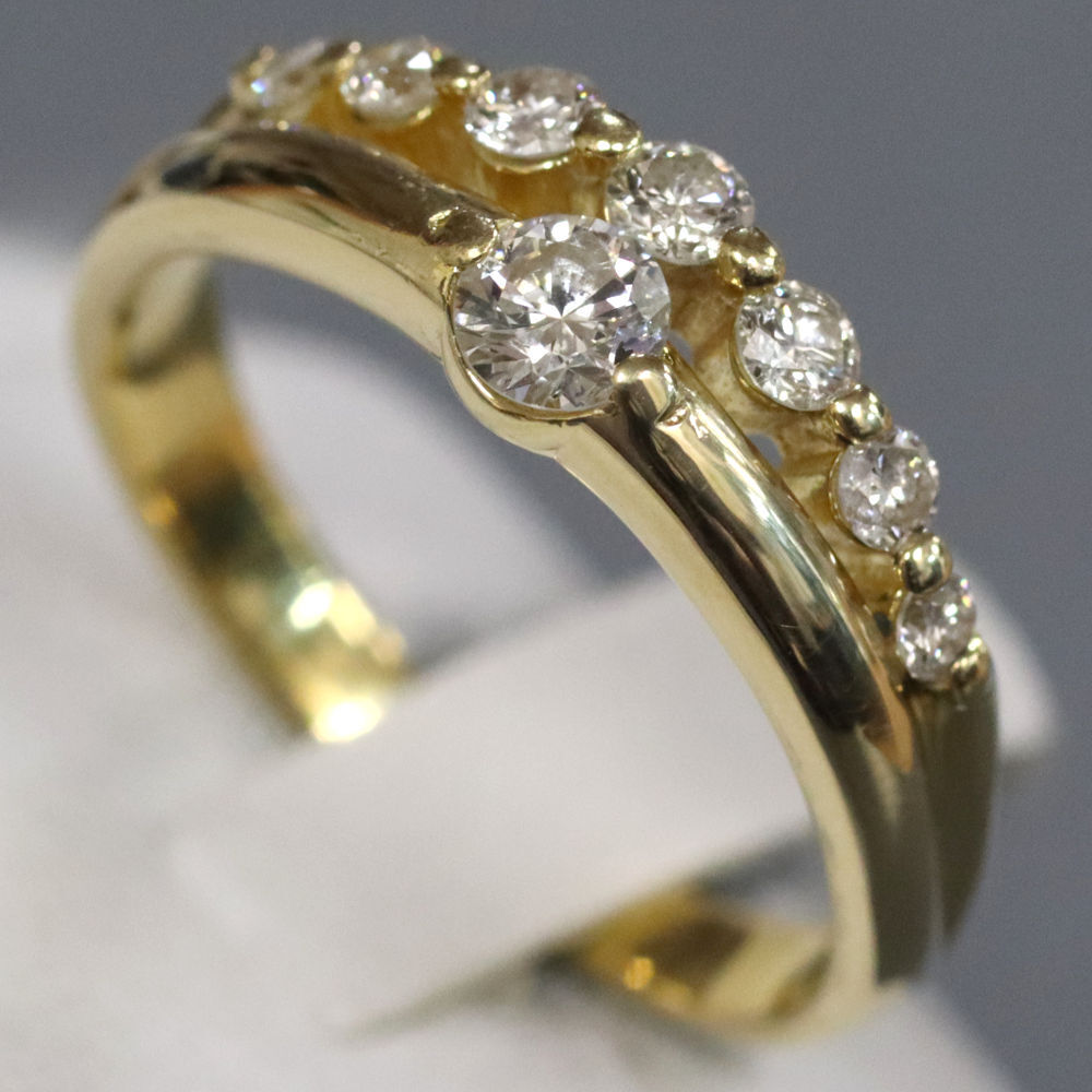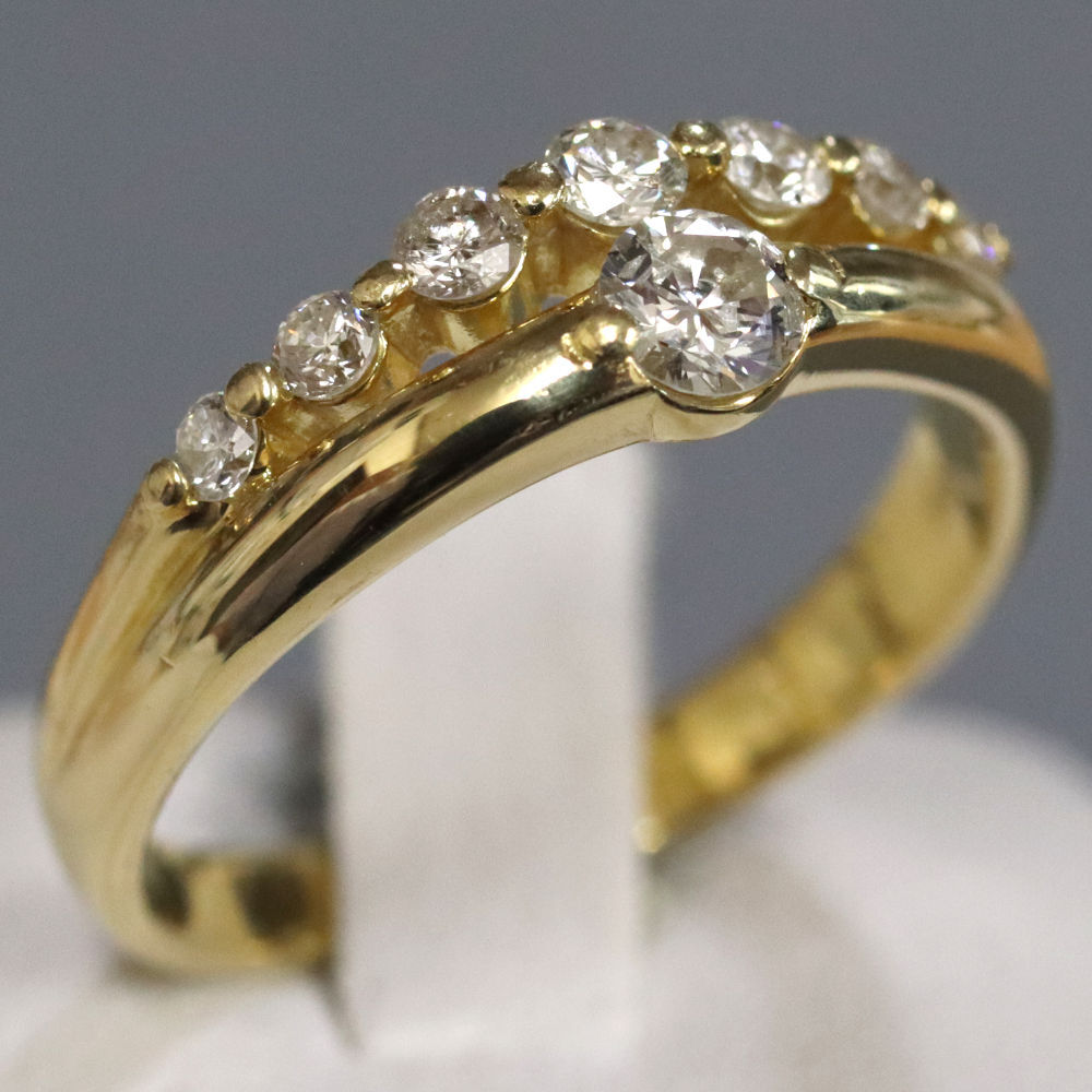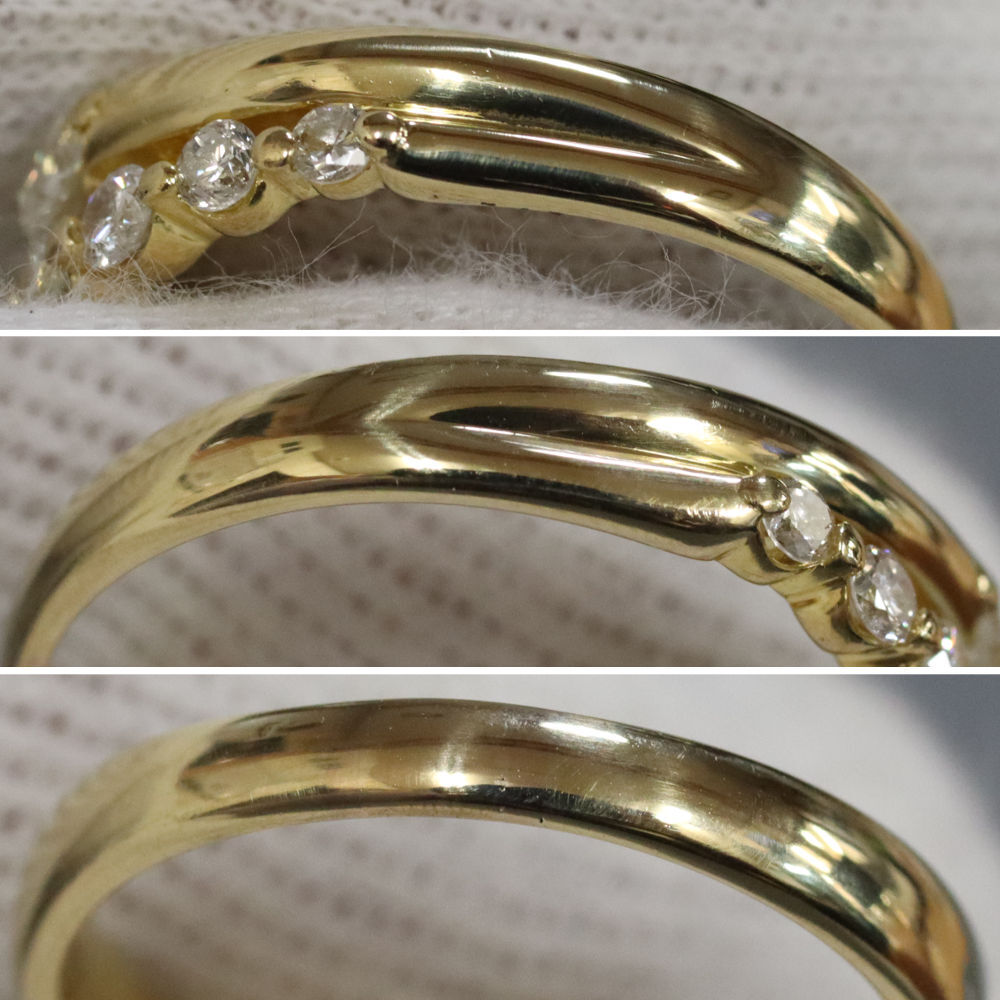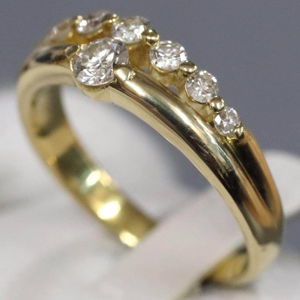 K18ダイヤモンドリングの中古品です。 計8ポイントのダイヤモンドがセットされております。 ダイヤモンドは、インクルージョンはありますが、輝きがあります。 メレダイヤモンドの1つに欠けがあります。 地金に使用に伴う傷、肉眼ではほとんど見えませんが底部にサイズ直しの跡があります。