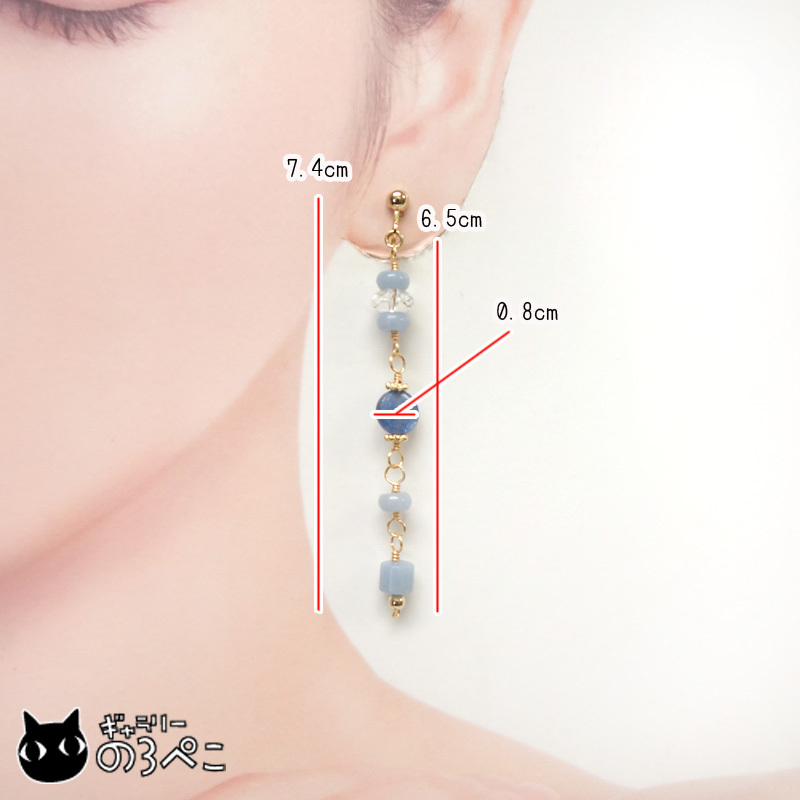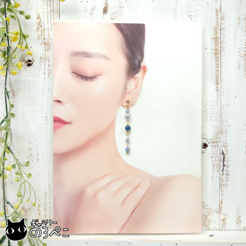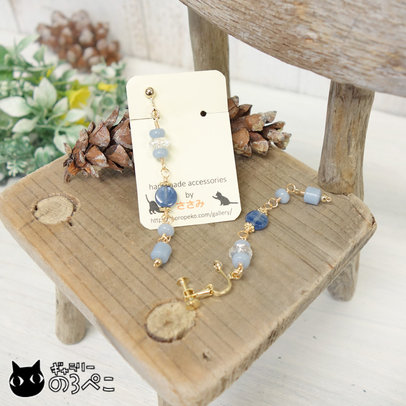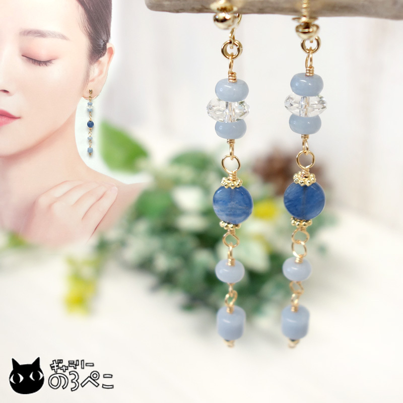 ニュアンスのあるくすみブルーのエンジェライトと深いブルーのカイヤナイトを合わせた、ロングタイプのイヤリングです。