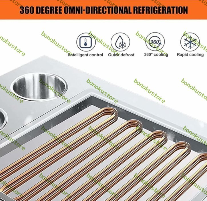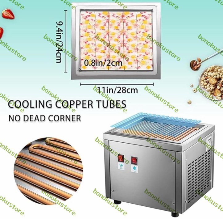 280W ロールアイスクリームメーカーには、大きな冷却プレートと均等に配置された銅製冷却チューブが付属しており、製品を -25°C から -30°C の温度に効果的に冷却します。