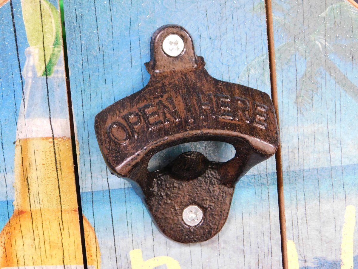 ラウンド型のボディには、ビーチ&コロナのイラスト、アイアン製の栓抜き部分は、サビ風のプリントが施されています。
