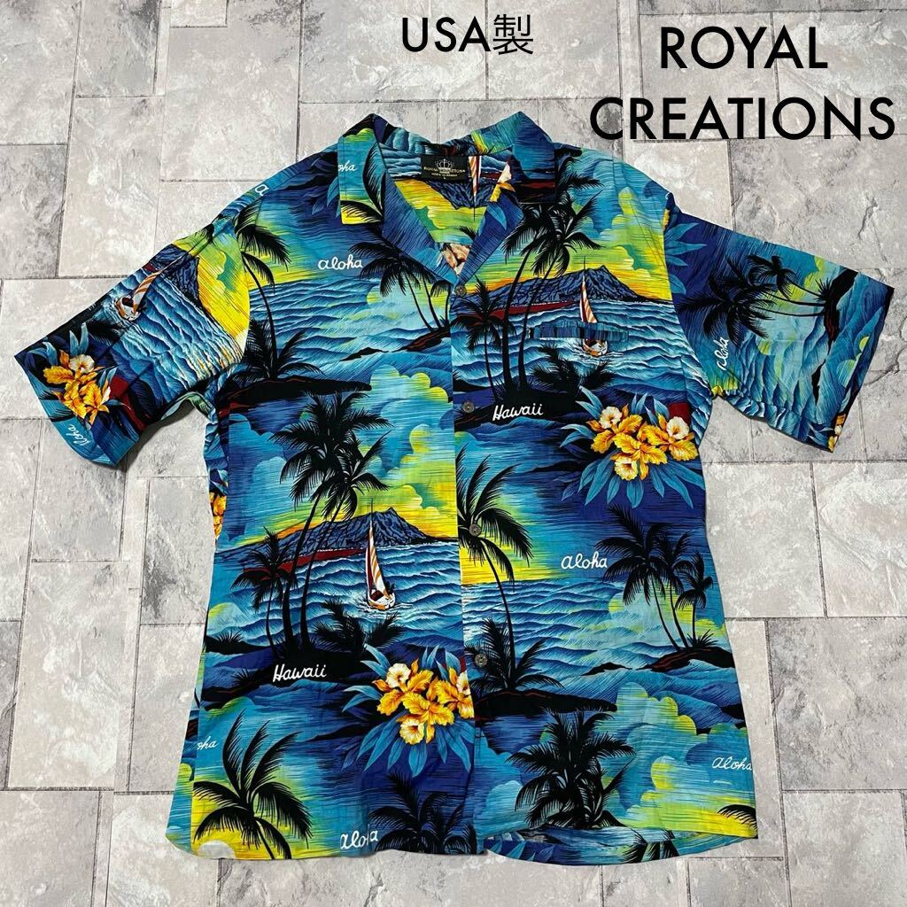 USA製 ROYAL CREATIONS ロイヤル クリエーションズ アロハシャツ 半袖シャツ オープンカラー 開襟 ハワイ製 総柄 ヤシの木 ブルー 玉SS1939