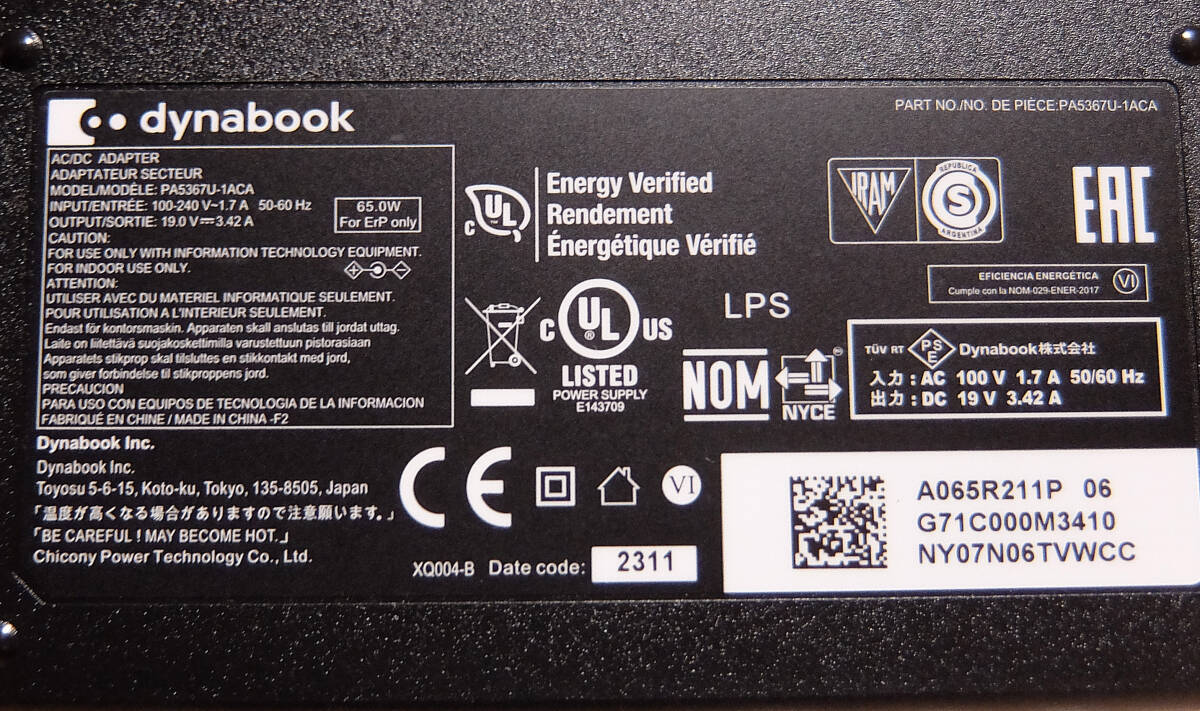 東芝 dynabook ダイナブック 純正ACアダプター PA5367U-1ACA G71C000M3410 65W 19V3.42A新品です。
