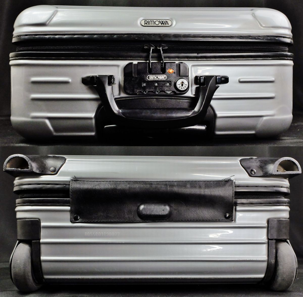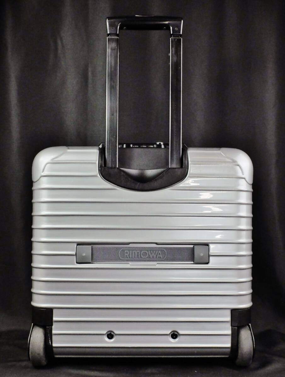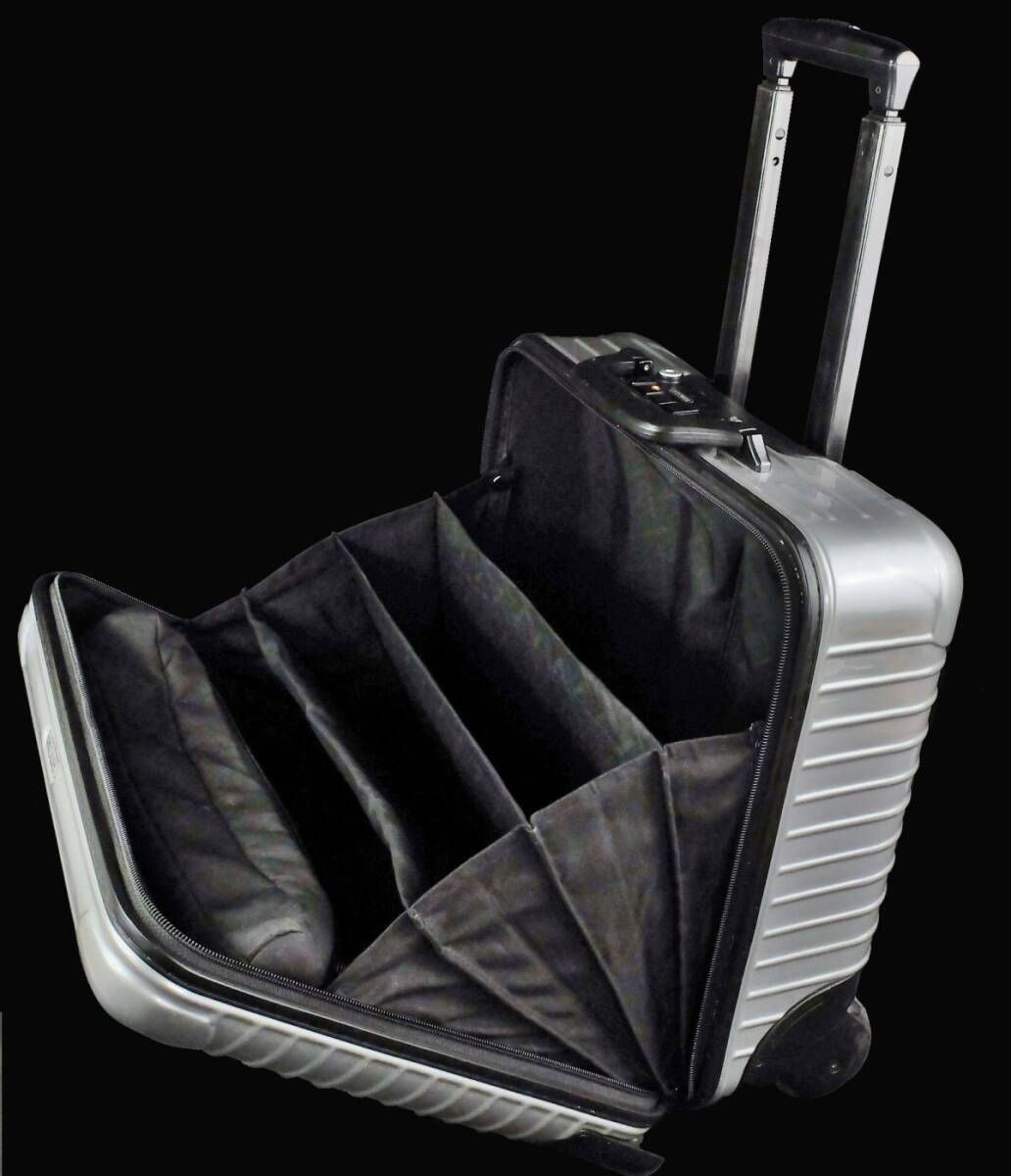 ● RIMOWA リモワの今年提携終了の為入手が困難となった稀少モデルのルフトハンザ・エディションの『サルサ』(エアライト)の805.40ビジネストロリー25Lのシルバーです。●廃盤となったやはり稀少な、勝手に動かず、故障リスクの少ない2輪のサルサビジネストロリーの、しかもポリカーボネートの硬質な深みを感じさせるシルバーのTSA仕様です。●外装には微細な小キズ、僅かな擦れなどは至近では認識可能なものの、クラック、凹み、目立った大きな傷などのないグロス仕上げのシルバーのポリカーボネート特有の硬質な外観がきれいに保たれています。●内装はこのエディション専用のLufthansaのモノグラムのライナーです。着脱式のアコーディオン・デバイダー、エレクトリカルコードポーチが付属しています。●テレスコハンドル、コンビネーションロック、ジップ、ホィールなどに機能的問題はありません。背面のゴムバンドは(入手困難なロゴ入りに)新品交換されておりタイトです。