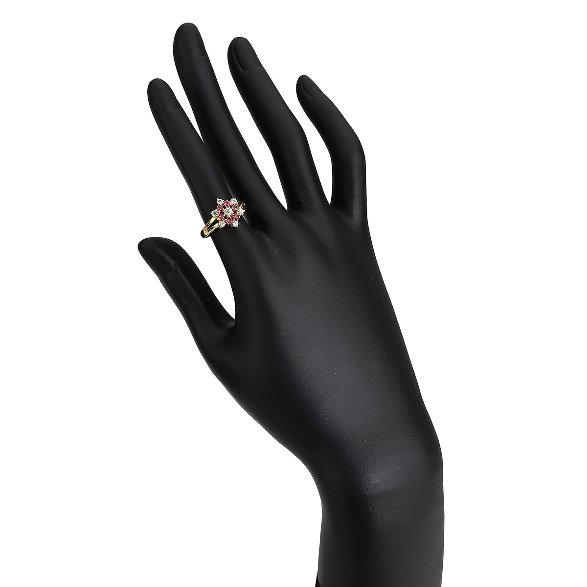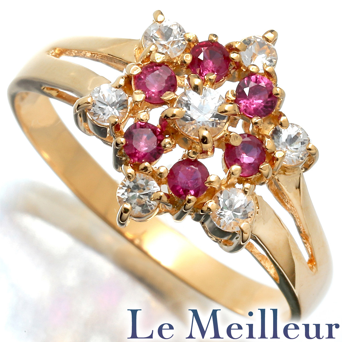 情熱的なルビーを花びらに見立て、繊細なダイヤモンドを添えて咲き誇る、美しく華やかなフラワーデザインのリング。ルビーの深紅の輝きと、ダイヤモンドの清らかな煌めきが見事に調和し、指元を優雅に彩ります。