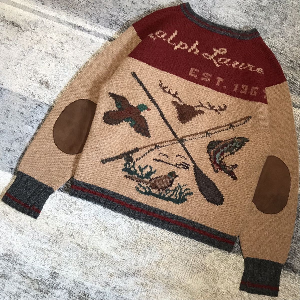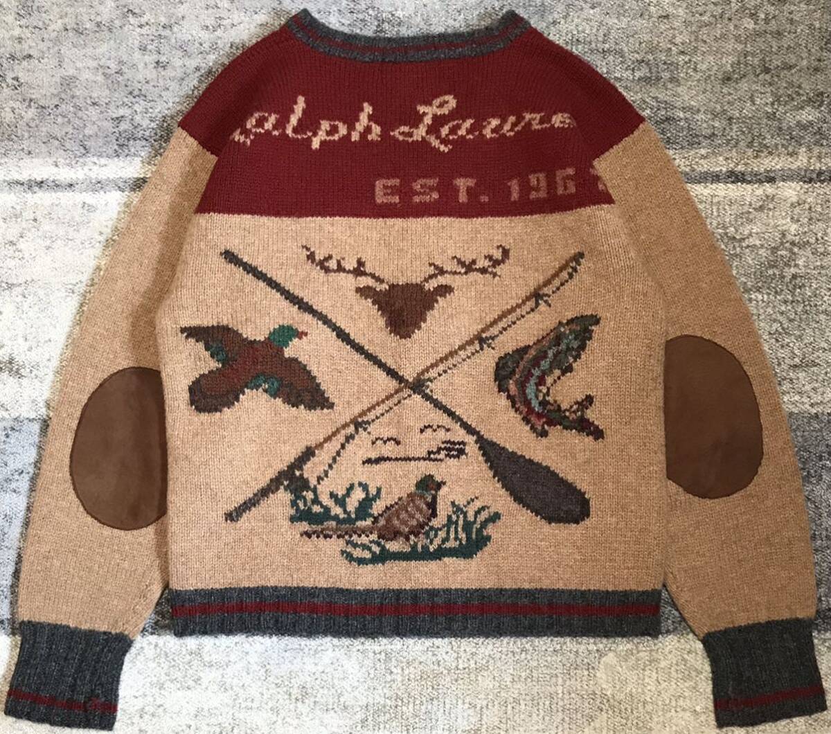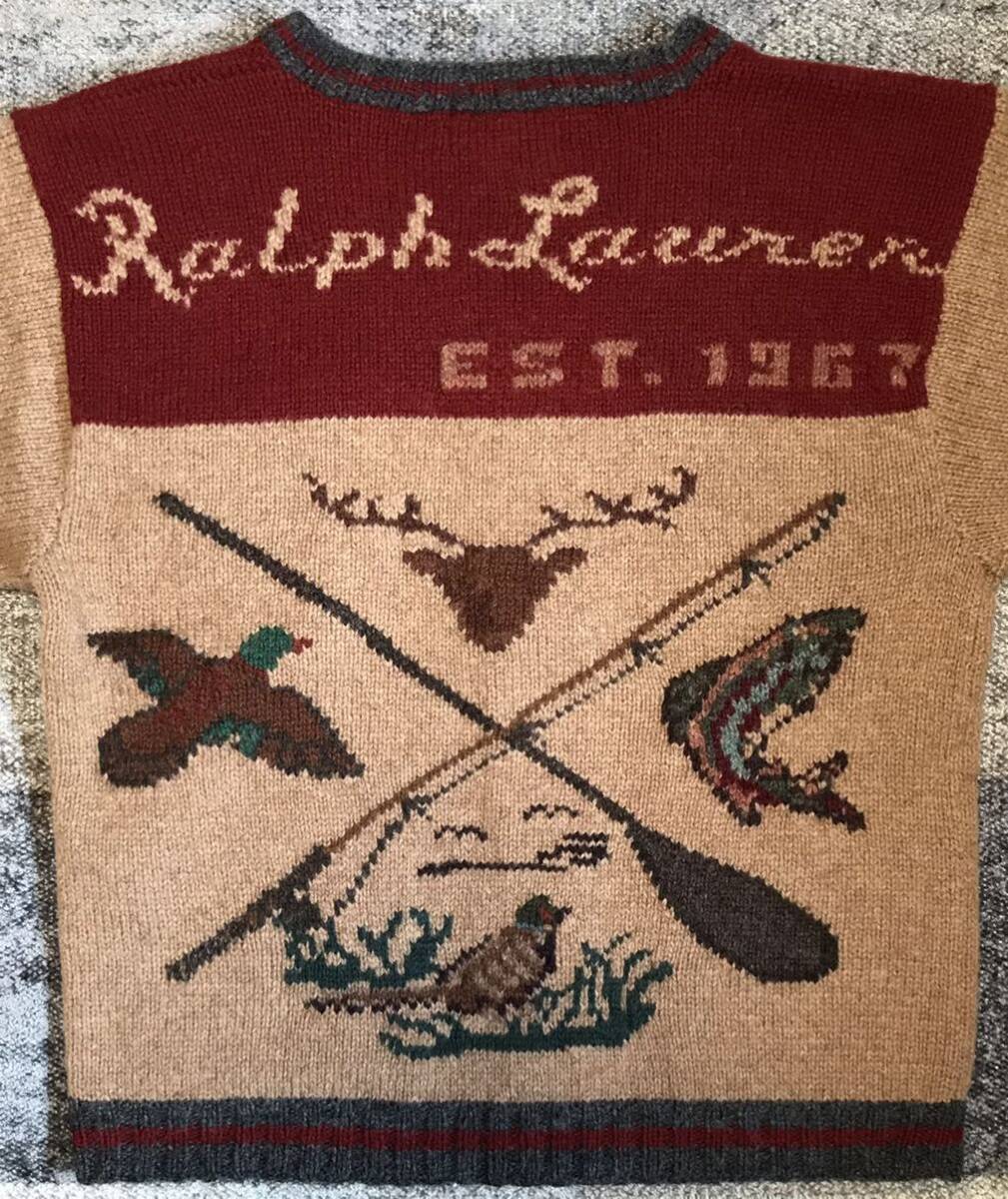 渋いボディに、襟、フロント、裾、袖のライン切替、そしてバックの釣り竿&パドル、鹿、鴨、雉、フィッシュ柄、絶妙な上部のカラー切替に「Ralph Lauren EST.1967」デザインが圧倒的な存在感を放つ、唯一無二の別格の1枚です。