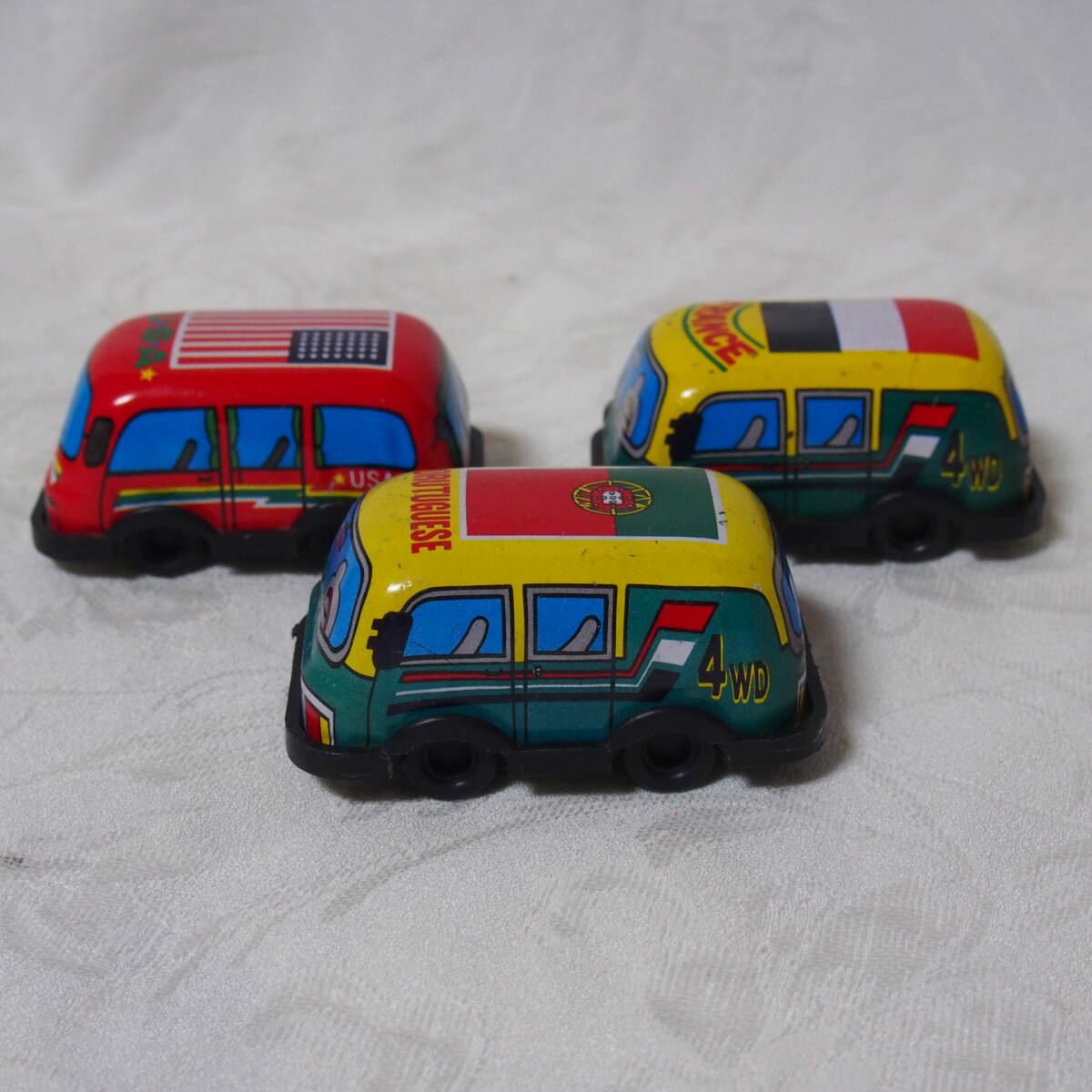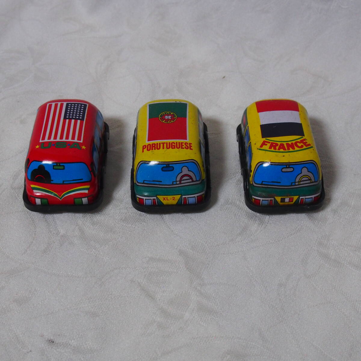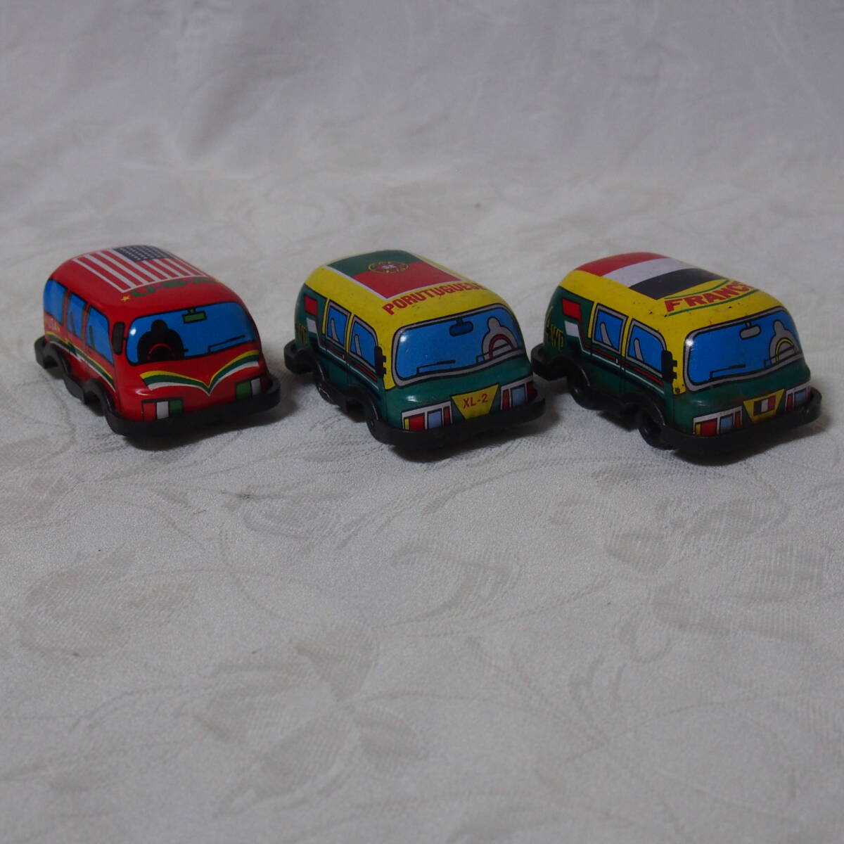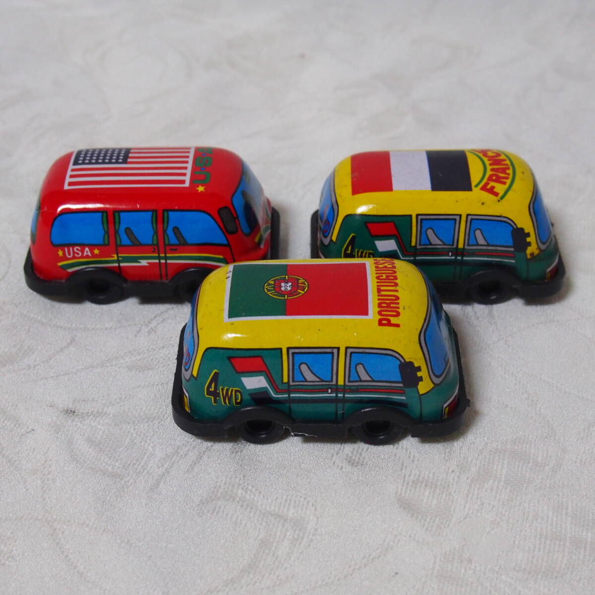 商品説明 ・・・「MADE IN JAPAN 製」 状態良好で状態良好なブリキ製トイ、 手押し式の「色違い・ FRANCE / PORUTUGUESE / U.S.A. 」の3台セット品です。動作の方は、「手押し」で動く仕掛けと成っています。程度の方は、 年代経過に寄る多少なりの使用感・保存感は有りますが、部品欠品も無く、状態の方は写真撮りでご確認下さい。「MADE IN JAPAN 製」 状態良好なブリキ製トイ、 手押し式の「 FRANCE / PORUTUGUESE / U.S.A. 」の3台セット品は如何でしょうか ・・。ちなみに 1個の大きさは 全長 7cm / 幅 4,3cm / 高さ 3,2cm と成っています。