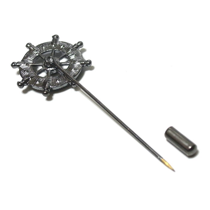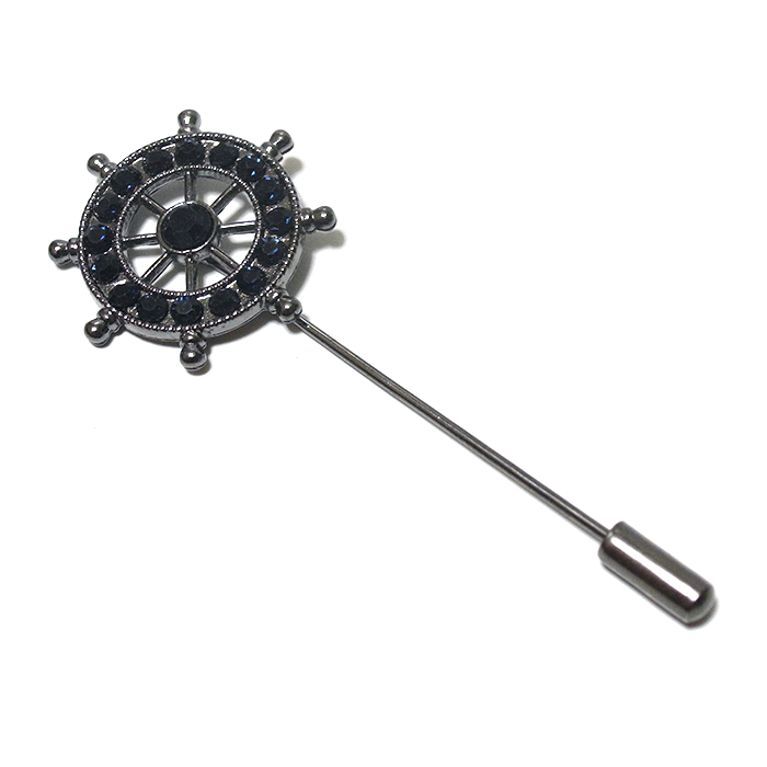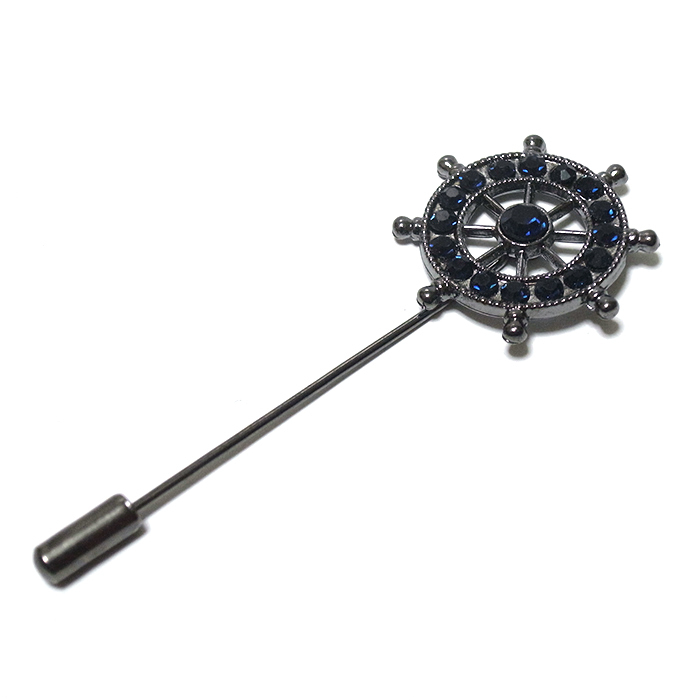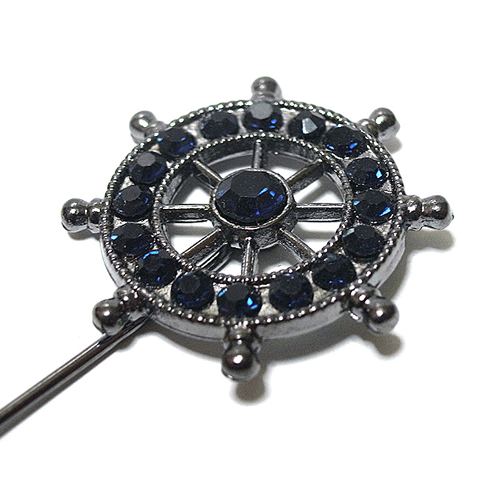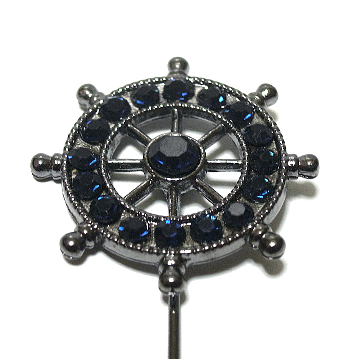 ラペルピン★スティック 操舵輪 ステアリング・ホイール ラインストーン ブラック×ブルー pin-1549