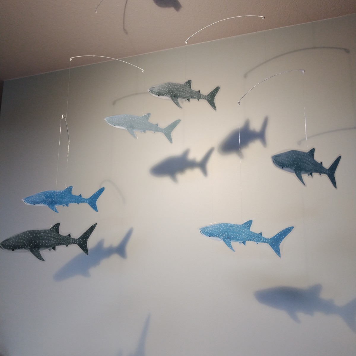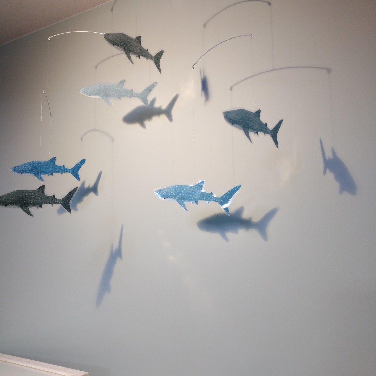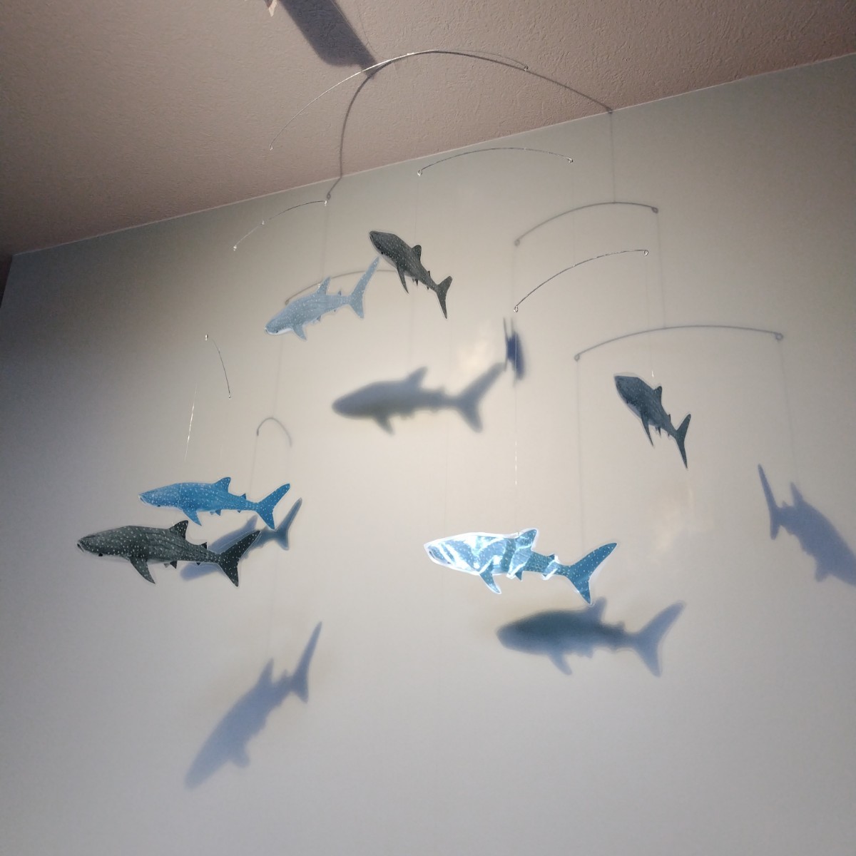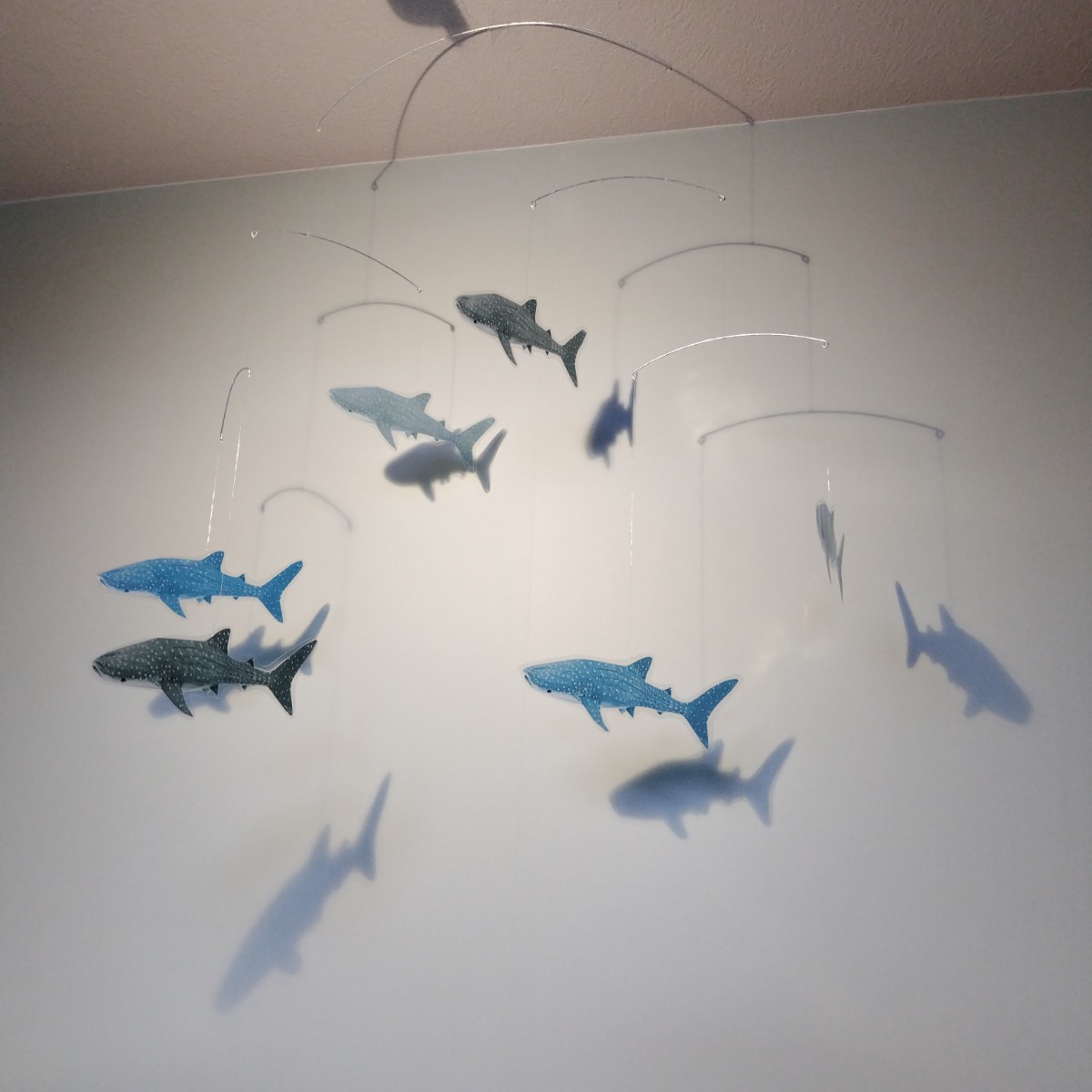 モビールとは動く彫刻。サメを糸や針金でつるし、それらがバランスを保ちながら、わずかな風で微妙に動くようにしたものです(*^^*)