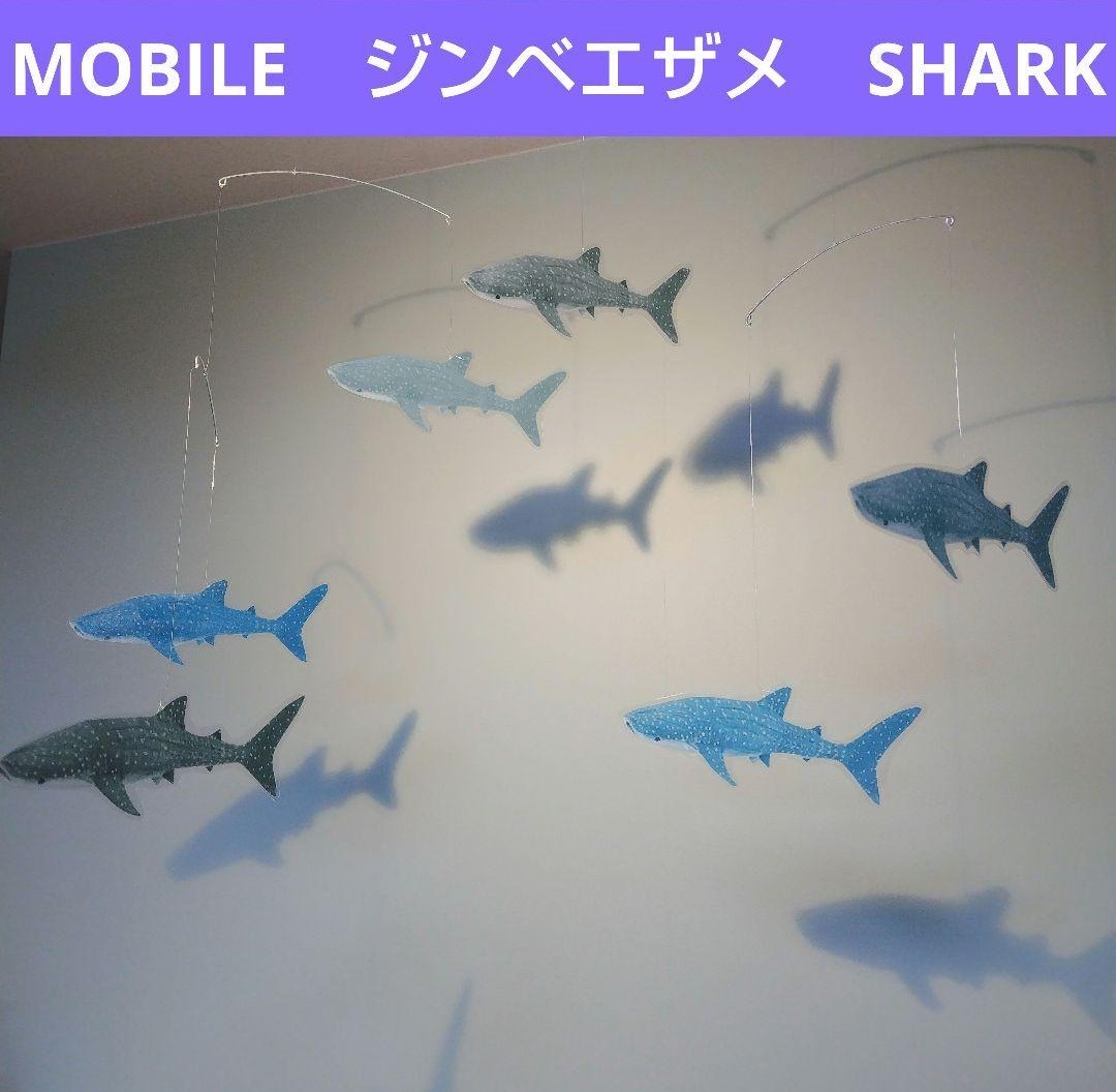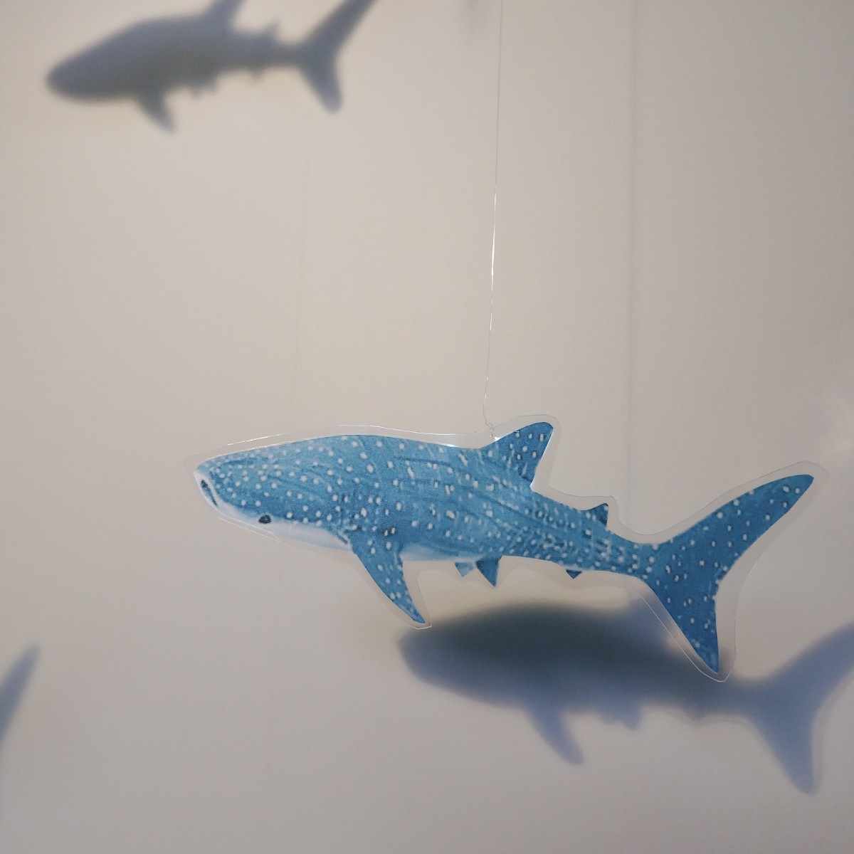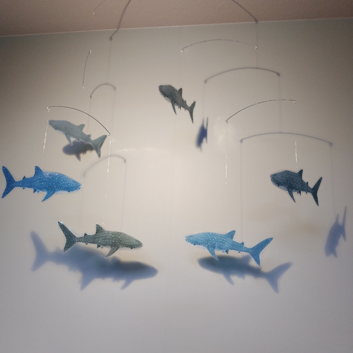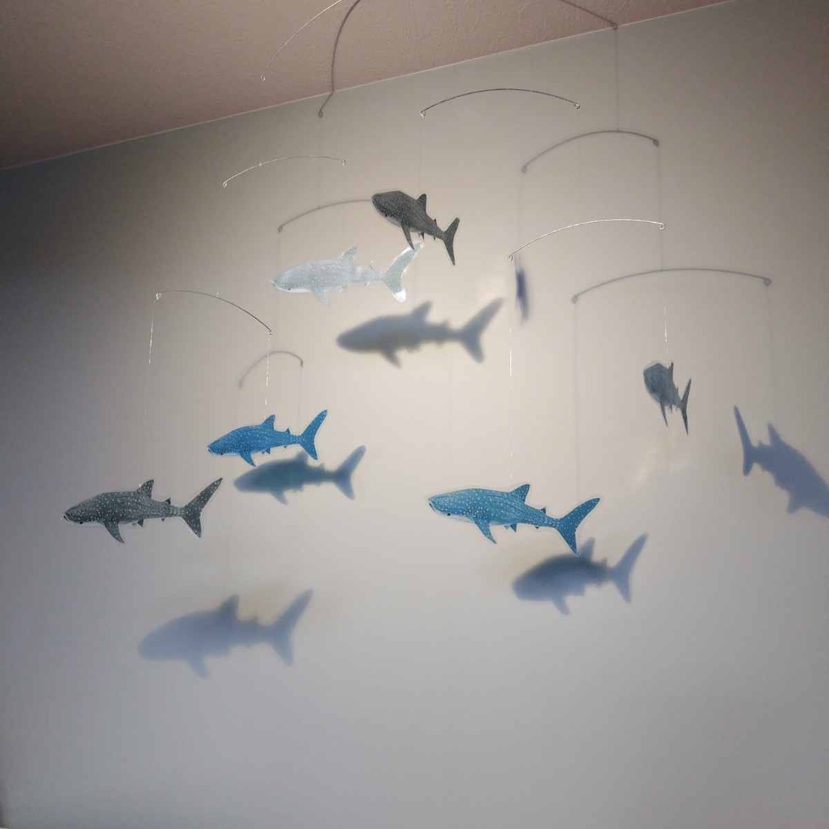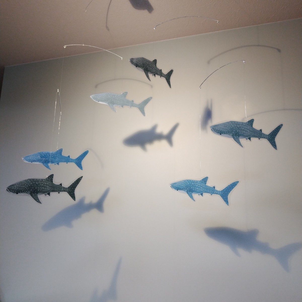モビールとは動く彫刻。サメを糸や針金でつるし、それらがバランスを保ちながら、わずかな風で微妙に動くようにしたものです(*^^*)
