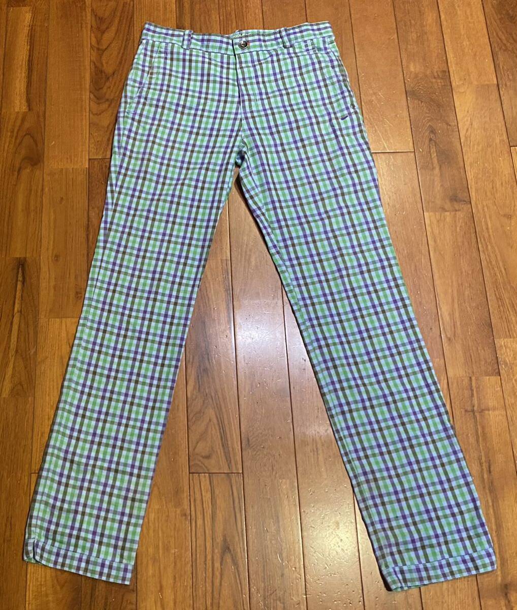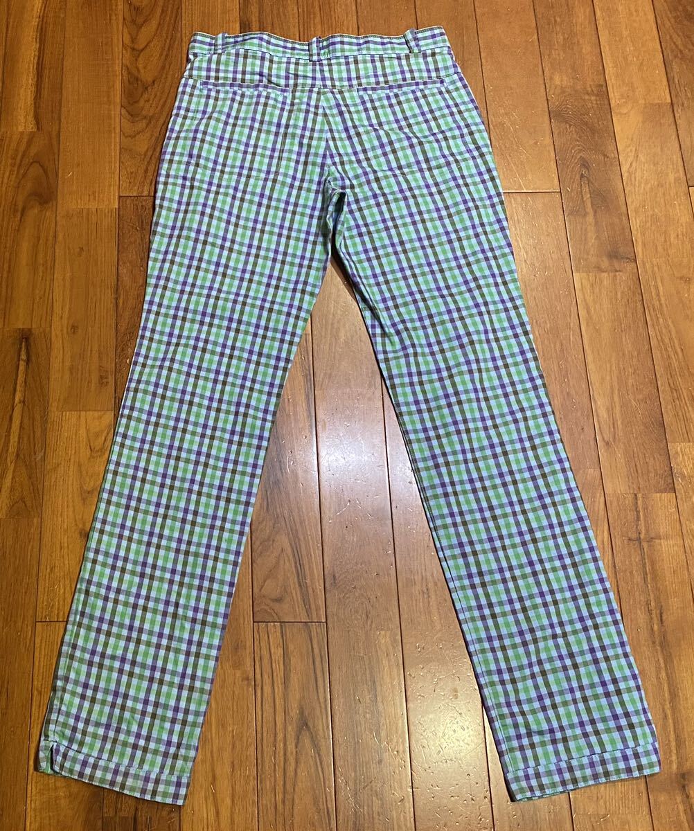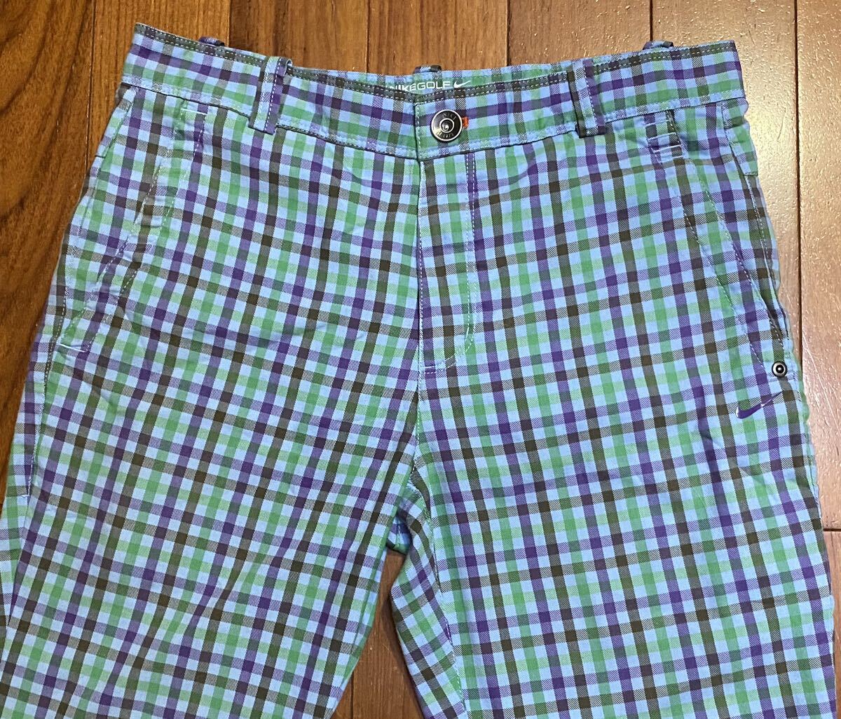 ナイキ ゴルフのストレッチパンツです。USEDですが状態は良いです(10段階中8程度)。生地はストレッチ入りで綿64%、ポリエステル36%です。ジッパーフライです。正規品です((株)ナイキジャパン、中国製)。サイズはW31(175/78A、W80 H95)でウエストは重ねずに平置きで約78cm、ヒップ約99cm、股上約25cm、股下約83cm、股下15cmのふともも部分約50cm、裾まわり約38cm、重量約300gです。発送はゆうパケットポストになります。