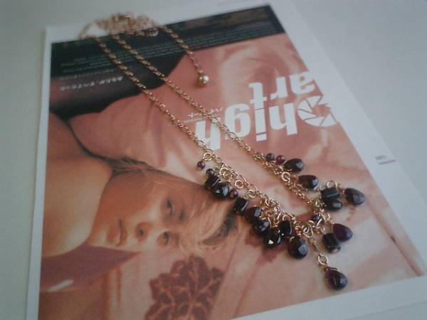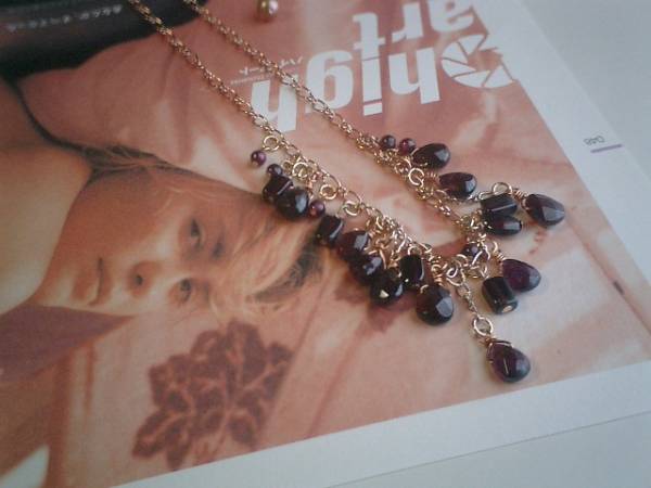 ナチュラル気分・・シリーズです♪ガーネットを集めて・・深い赤のガーネットのネックレスです♪4ミリの丸玉、7ミリのチューブ、8ミリから9ミリのドロップカットなどデザイン違いのガーネットにピンクゴールドのチェーンを合わせて可憐な表情です♪長さは全長72センチ位で調節自由です♪お揃いのブレスレットやピアスも出品しています♪シンプルで飽きのこないいつまでも着けられるデザインを考えて作りました!ハンドメイドをご理解頂いてノークレーム、ノーリターンでお願いします