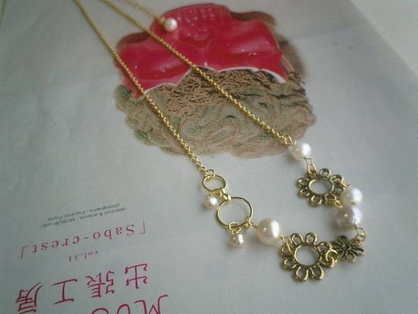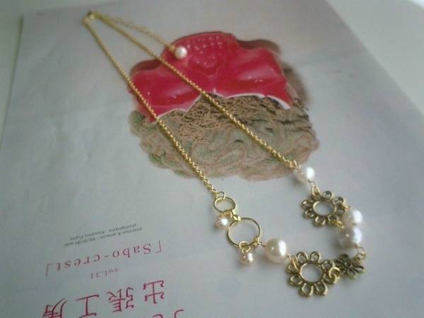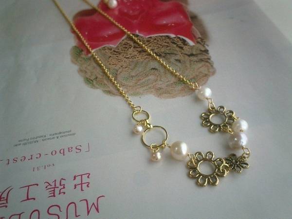 後ろボタンのワンピース・・シリーズです♪パール見本帖・・キュートな淡水パールのネックレスです♪可憐なお花のチャームやデザインリングを合わせてアンティークモダンな表情です♪5ミリから9ミリ位までのポテトの淡水パールにお花のチャームやデザインリングを合わせました♪長さは55センチ+アジャスター10センチで最長65センチ位です♪お揃いのブレスレットも出品しています♪♪シンプルで飽きのこないいつまでも着けられるデザインを考えて作りました!ハンドメイドをご理解頂いてノークレーム、ノーリターンでお願いします
