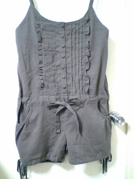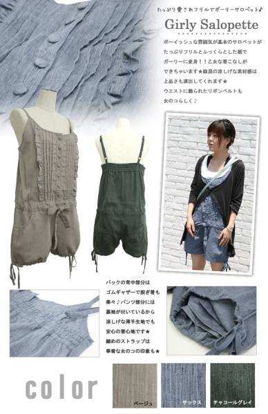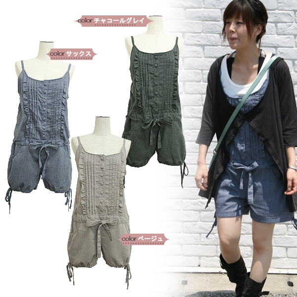サロペット フリル リボン タック ショートパンツ オーバーオール オールインワン チャコールグレー