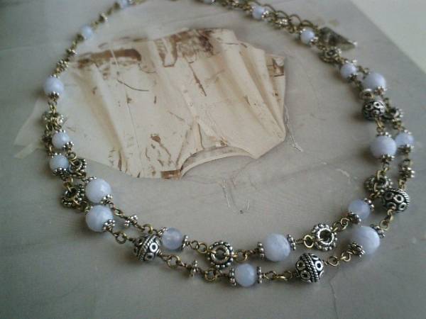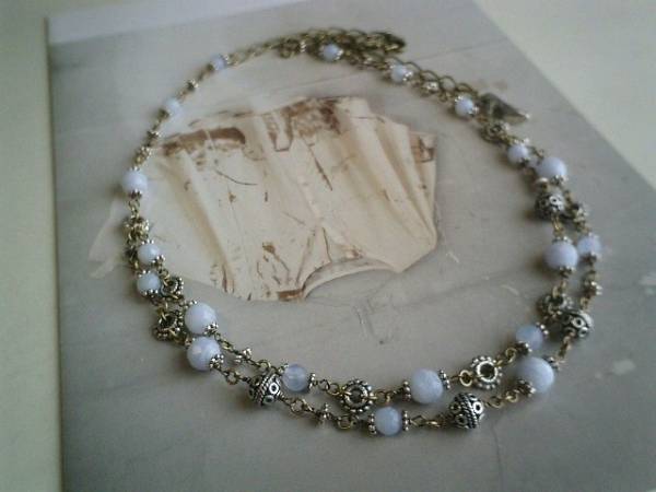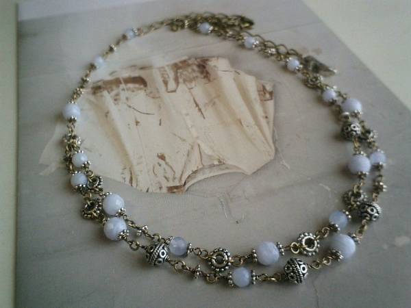 秋色・セレクション・・シリーズでス♪可憐な水色・・神秘的なブルー・レースの2連のネックレスです♪6ミリ、8ミリのランダムカットのブルー・レースにデザインメタルやチャームを合わせて大人のロマンチックしています♪長さは全長72センチ位で調節自由です♪チョーカー風にされても素敵です♪お揃いのブレスレットも出品しています♪シンプルで飽きのこないいつまでも着けられるデザインを考えて作りました!ハンドメイドをご理解頂いてノークレーム、ノーリターンでお願いします