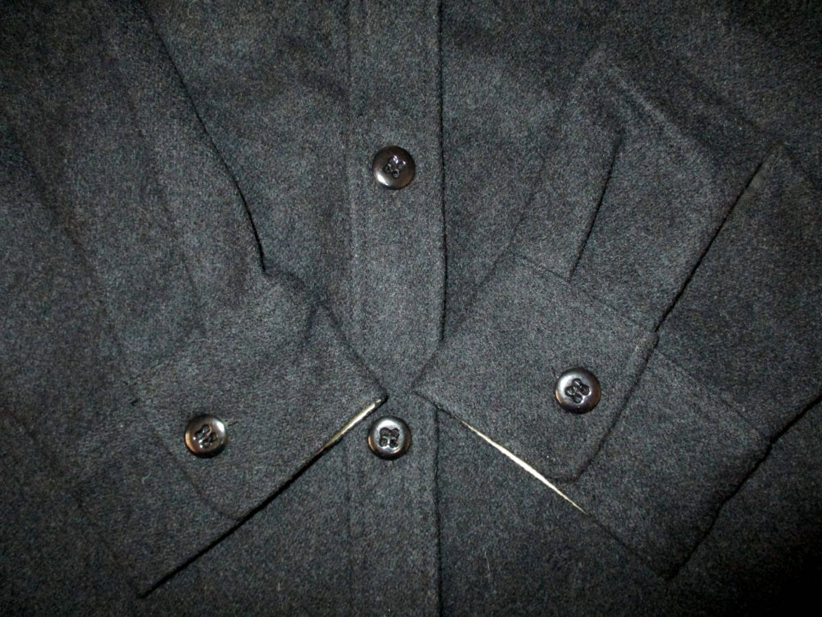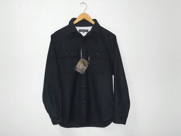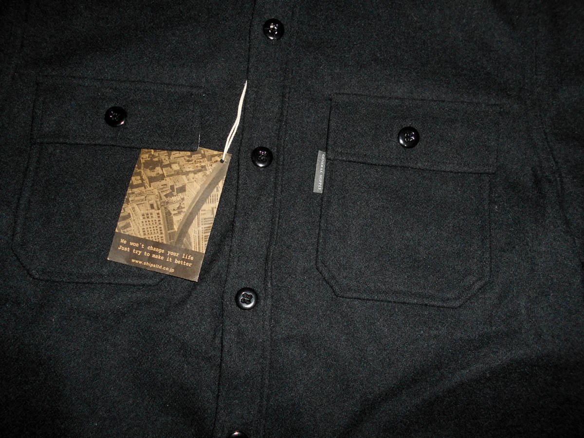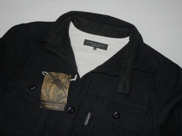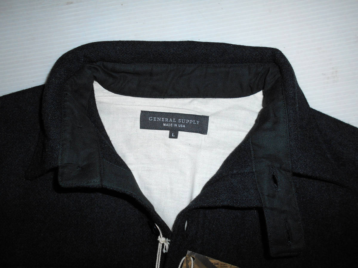 未使用★シップスGENERAL SUPPLY チンスト付のウールシャツ黒? Lです。株式会社シップス USA製の正規品です。素材は毛100、別地 綿100です。色は黒系だと思いますが個人判断ですので画像でご判断ください。