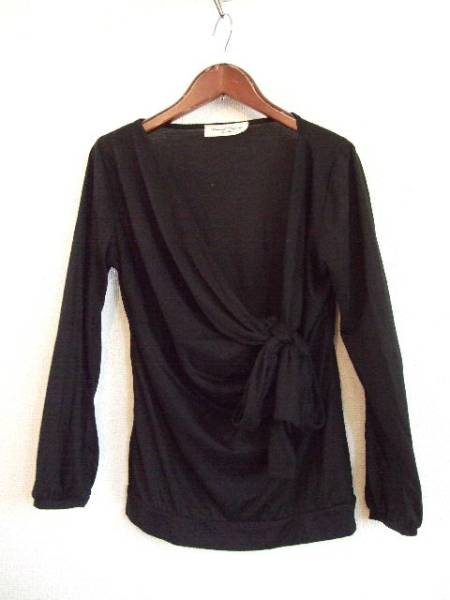 | 商品紹介 | 左胸でリボンを結ぶデザインの長袖カットソーです。 テロンとした素材感で色は黒です。 素材:ポリエステル65% レーヨン35% |