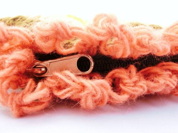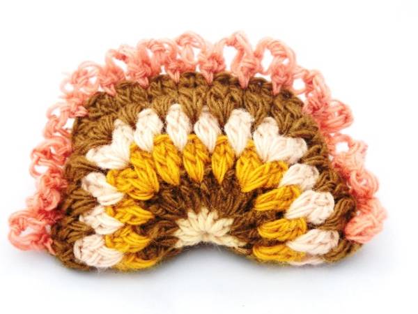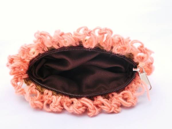 ハンドメイドの毛糸バッグ、立体的にできていて可愛らしいデザインです。