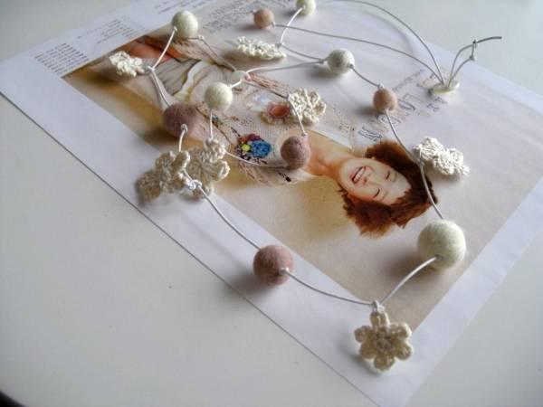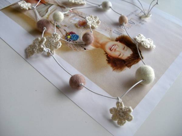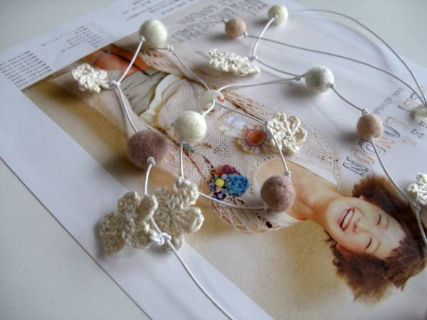 愛らしさの条件・・シリーズです♪フェルト玉マニアⅣ・・ふんわりやさしいフェルト玉のネックレス、ブレスレットの2点セットです♪サーモンピンクやベージュピンク、ナチュラルホワイトなどやさしい色のフェルト玉やホワイトベージュの編みフラワーを白のレザーコードに紡いでキュートな表情です♪フェルト玉は10ミリから20ミリ位までの大きさ違い、編みフラワーは20ミリから30ミリ位の大きさ違いです♪ネックレスは95センチ位で調節自由です♪ブレスレットは28センチ位で調節出来ます♪単品やイヤリングも出品しています♪ハンドメイドをご理解いただいてノークレーム、ノーリターンでお願いします♪