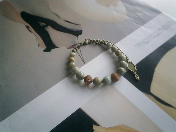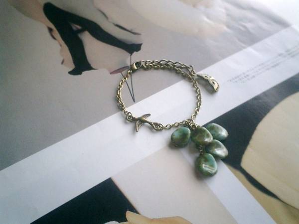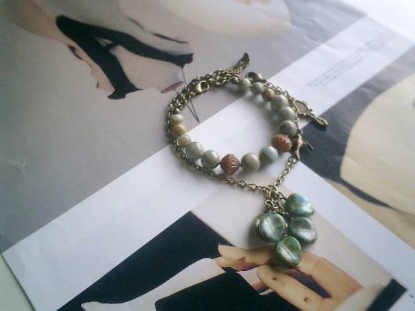 天使の時間・・シリーズです♪巴里の夕暮れ・・シックなアンティークグリーンのインプレッションストーンとチェコビーズのブレスレット2点セットです♪やさしいモスグリーンのストーンやチェコビーズに小鳥さんのデザインチェーンを合わせてロマンチックな表情です♪6ミリ、8ミリのグラデーションのストーンのブレスレットにはデザインチェコを合わせました♪長さは16センチ+アジャスター6センチで最長22センチ位です♪12×9ミリのチェコビーズには小鳥さんのデザインチェーンを合わせました♪長さは16センチ+アジャスター6センチで最長22センチ位です♪トップは3・5センチ位です♪それぞれ単品やネックレスやイヤリングも出品しています♪シンプルで飽きのこないいつまでも着けられるデザインを考えて作りました!ハンドメイドをご理解頂いてノークレーム、ノーリターンでお願いします