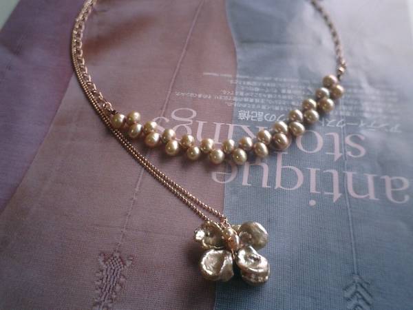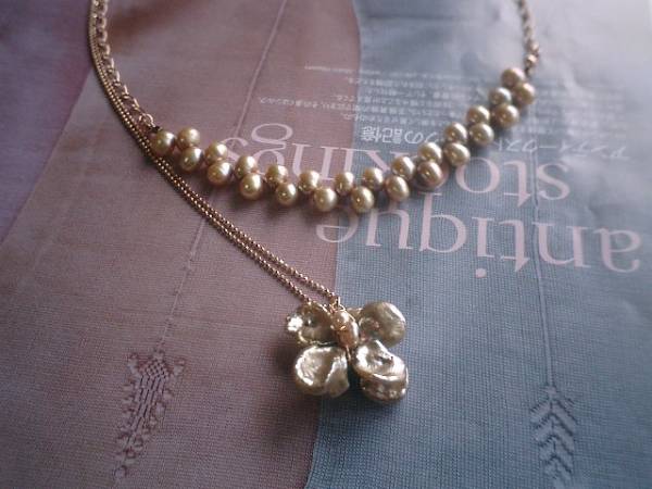ネオ・ロマンチック・・シリーズです♪女の子のパール・・シックなシャンパンゴールドのネックレス2点セットです♪花びらのような芥子パールやライスの淡水パールに繊細なピンクゴールドのチェーンを合わせてやさしい表情です♪長い方は12ミリから14ミリ位の芥子パールを重ねて花びらにしました♪長さは72センチ+アジャスター15センチで最長87センチ位です♪トップは3センチ位です♪ライスの淡水パールはシンプルに繋いで合わせやすいデザインです♪長さは全長65センチ位で調節自由です♪それぞれ単品やブレスレットも出品しています♪♪ハンドメイドをご理解頂いてノークレーム、ノーリターンでお願いします。
