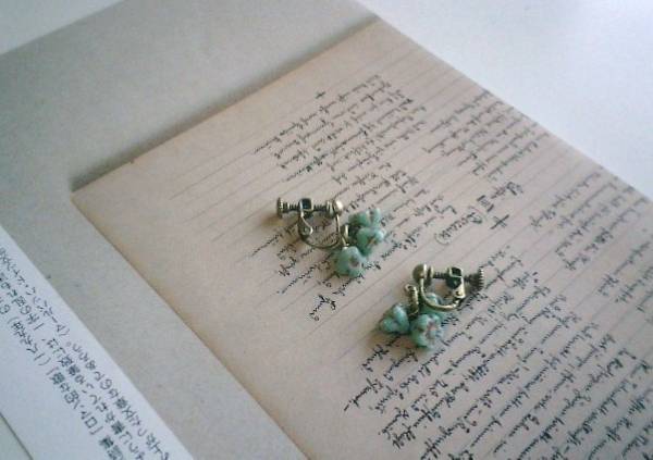 ガールズ・レッスン・・シリーズです♪可憐なチェコのお花のイヤリングです♪シックなターコイズ色のお花がやさしい表情です♪8ミリ位のチェコのお花を集めて小さな花束にしました♪長さは全長2センチ位です♪ピアスにも変更出来ます♪お揃いのネックレスやブレスレットも出品しています♪シンプルで飽きのこないいつまでも着けられるデザインを考えて作りました!ハンドメイドをご理解頂いてノークレーム、ノーリターンでお願いします