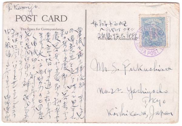 田沢新大正毛紙1銭5厘貼はがき 大洋丸船内→東京宛