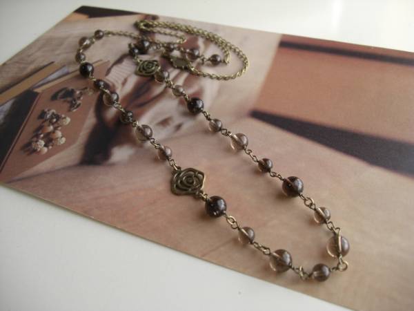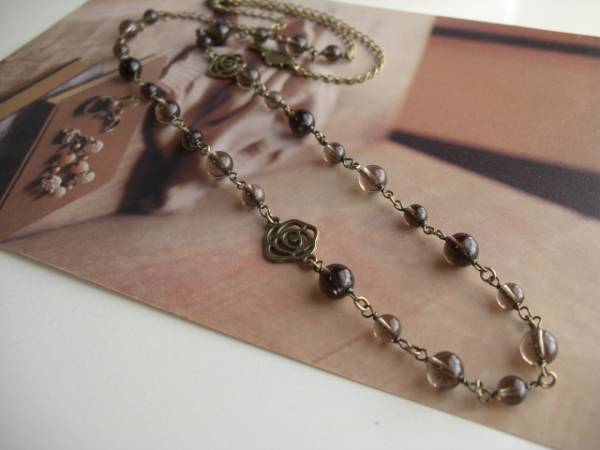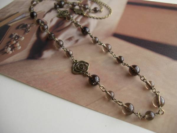 ネオ・ロマンチック・・シリーズです♪モノトーンの薔薇・・繊細なスモーキークォーツのネックレスです♪薔薇のチャームを合わせてアンティークな表情です♪6ミリ、8ミリの丸玉のスモーキークォーツに薔薇のチャームを合わせました♪長さは全長82センチ位で調節自由です♪お揃いのネックレスやブレスレットも出品しています♪シンプルで飽きのこないいつまでも着けられるデザインを考えて作りました!ハンドメイドをご理解頂いてノークレーム、ノーリターンでお願いします