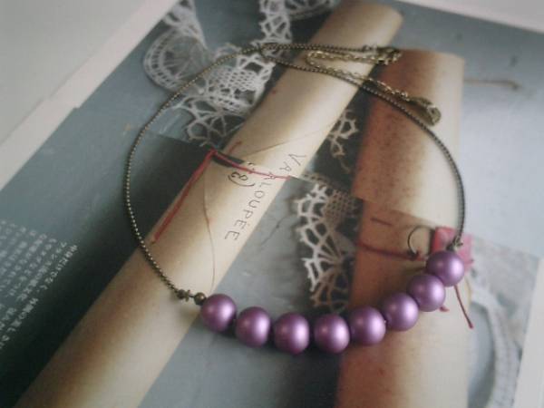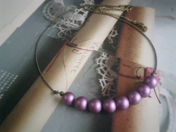 クレアの衣装箱・・シリーズです♪パール・レッスンⅣ・・ビロードのような光沢のガラスパールのネックレスです♪マットなダークパープルのガラスパールは12ミリの丸玉です♪華奢なデザインチェーンを合わせました♪長さは55センチ+アジャスター12センチで最長67センチ位です♪お揃いのネックレスやブレスレットやイヤリングも出品しています♪シンプルで長く着けられるデザインを考えて作りました!ハンドメイドをご理解頂いてノークレーム、ノーリターンでお願いします