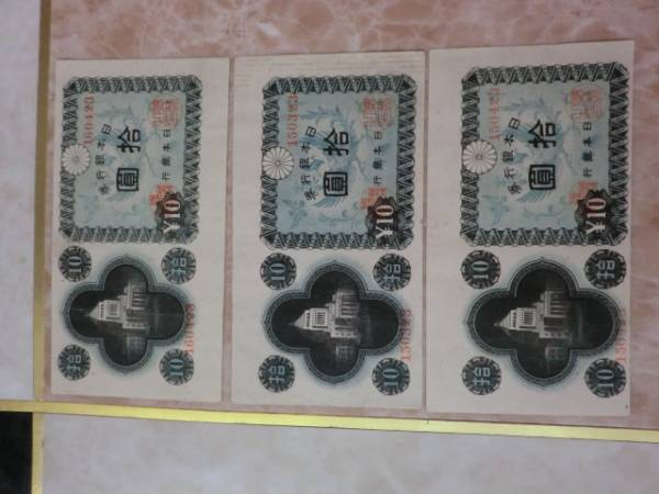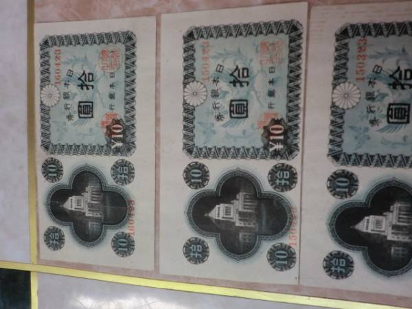 日本銀行券A号10円 議事堂10円の富士工場を3枚セットで裁断のズレが有ります。