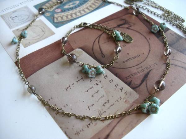 ロマンチックを紡いで・・シリーズです♪秘めた想い・・シックなスモーキークォーツとチェコのお花のネックレスとブレスレット2点セットです♪6ミリ、8ミリの丸玉のスモーキークォーツにターコイズ色のチェコのお花を合わせて可憐な表情です♪ネックレスの長さは全長95センチ位で調節自由です♪2連にされても素敵です♪ブレスレットは23センチ位で調節自由です♪それぞれ単品やピアスも出品しています♪シンプルで飽きのこないいつまでも着けられるデザインを考えて作りました!ハンドメイドをご理解頂いてノークレーム、ノーリターンでお願いします